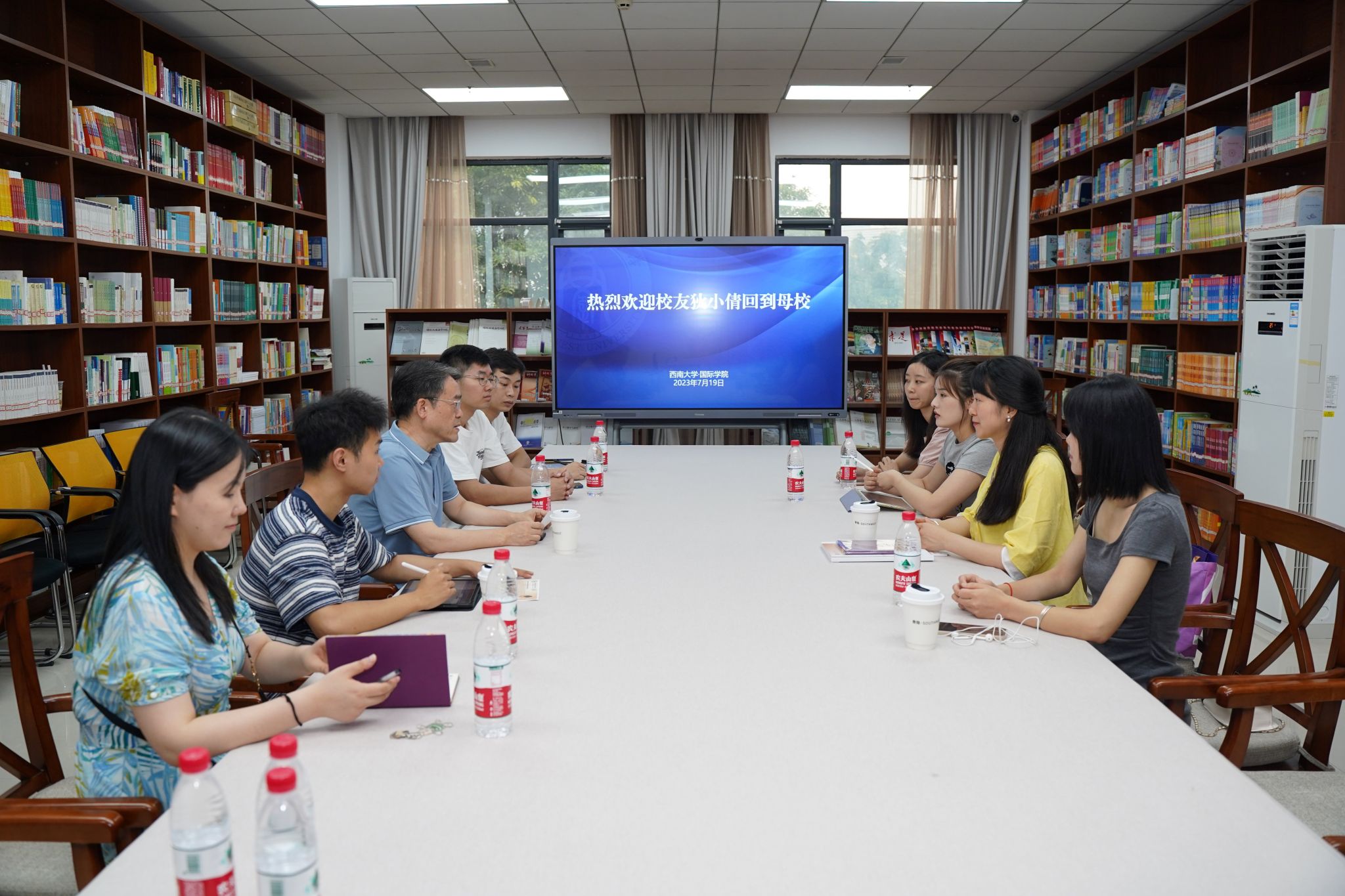 2023年7月19日下午3点在紫云楼图书馆,捷克布拉格金融管理大学中文教师、查理大学在读博士、365上市公司(英国)集团2014级汉硕毕业生狄小倩受邀回到母校,分享职业阅历和经验,共商学院“两高”建设(国际学生中国国情教育高地和国际中文教育高地),刘猛书记,马若晨主任以及在读汉硕生代表参加座谈会。