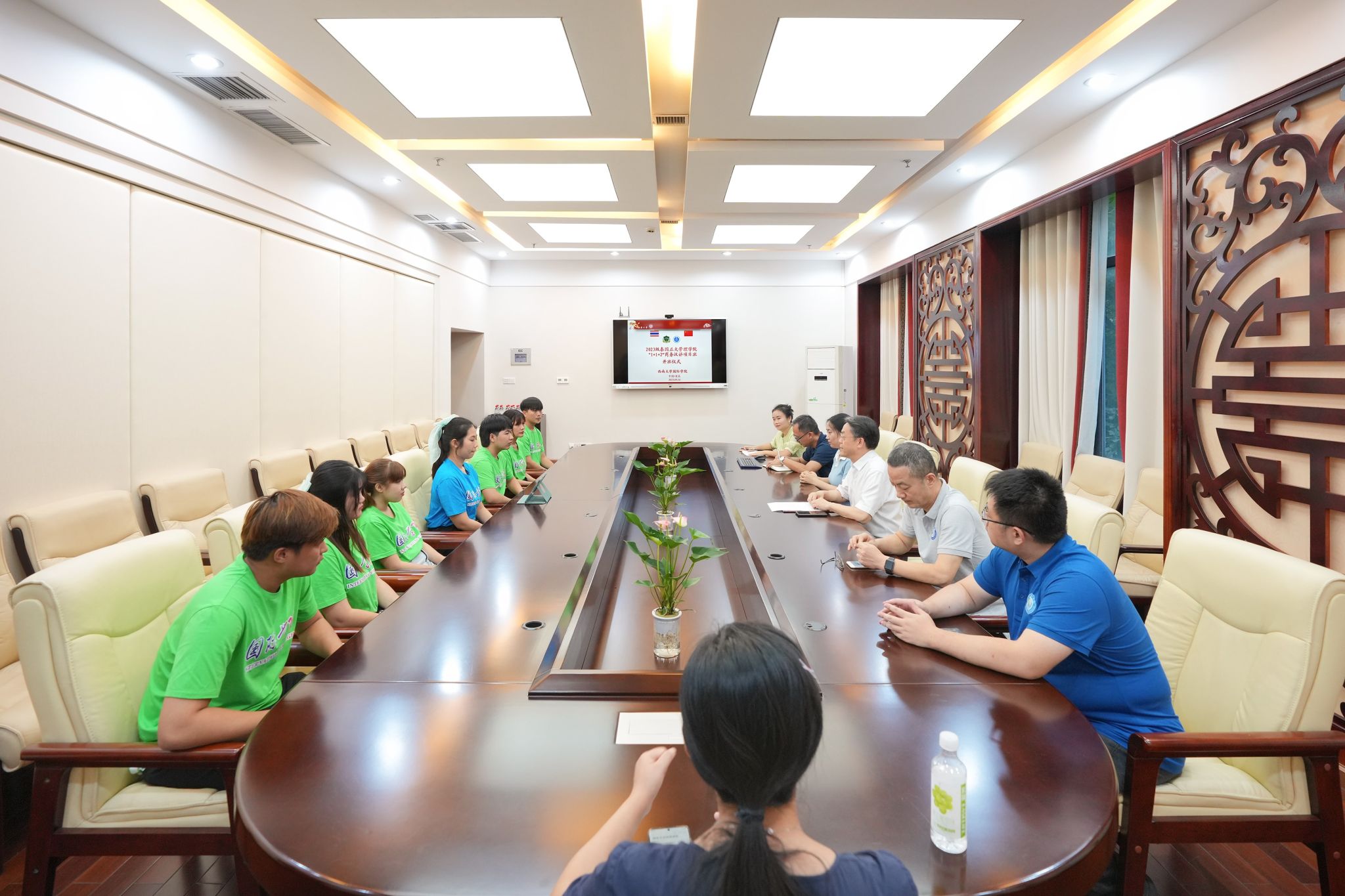 9月14日下午,365上市公司(英国)集团在紫云楼签约室通过“线上+线下”方式隆重举行正大管理学院2023级“1+1+2”商务汉语项目班开班仪式,泰国正大管理学院人文学院陈明明院长,苏兆伟老师和周小月老师,365上市公司(英国)集团党委书记刘猛,副院长李航,项目班主任李丹、任课教师代表刘妍芹和冯换叶、招生办黄无为主任和项目负责人王鹊,以及项目班全体新生参加仪式。