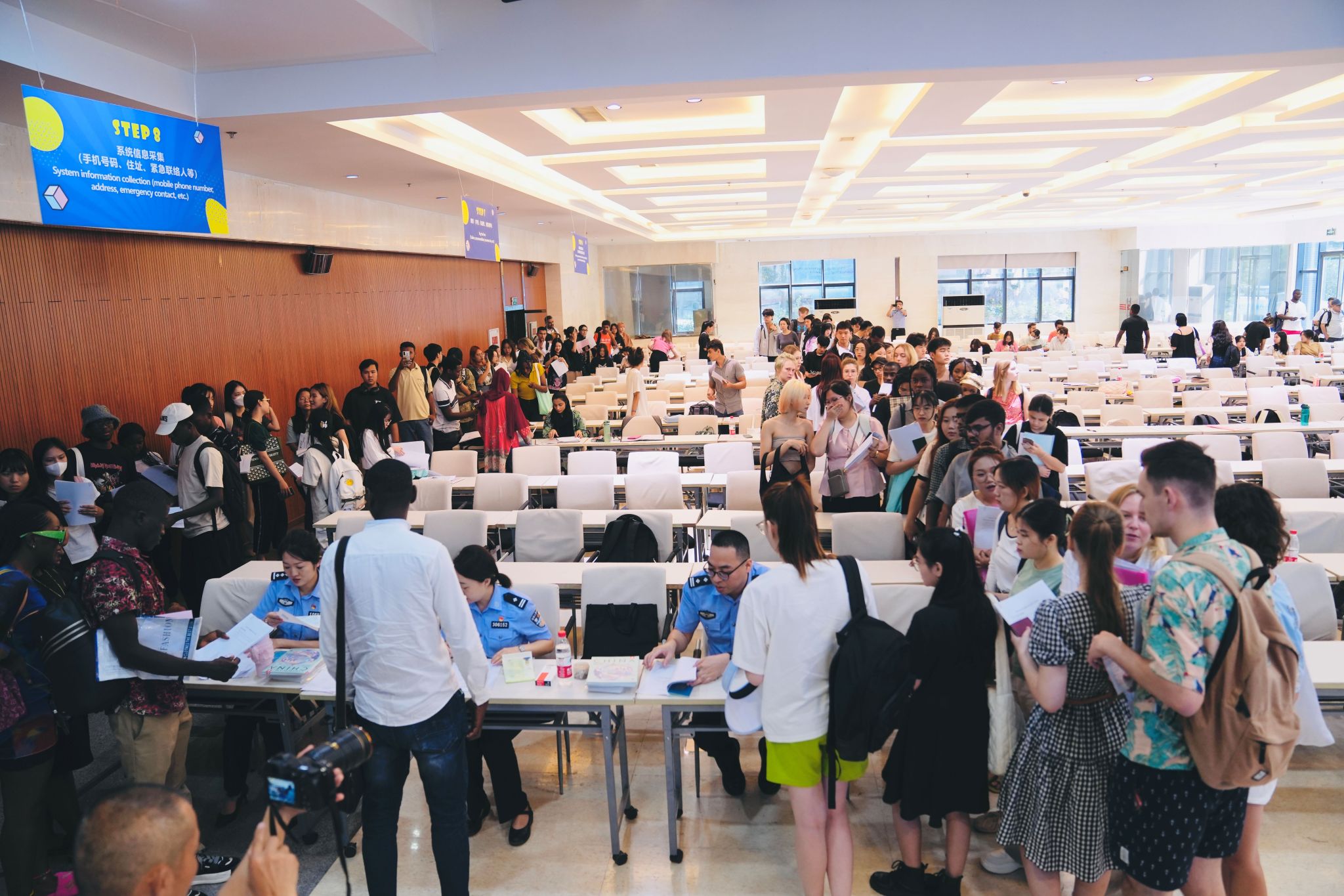随后,警官们为全体新生做现场签证面签,逐一检查留学生签证材料,确保每人材料完整且有效。