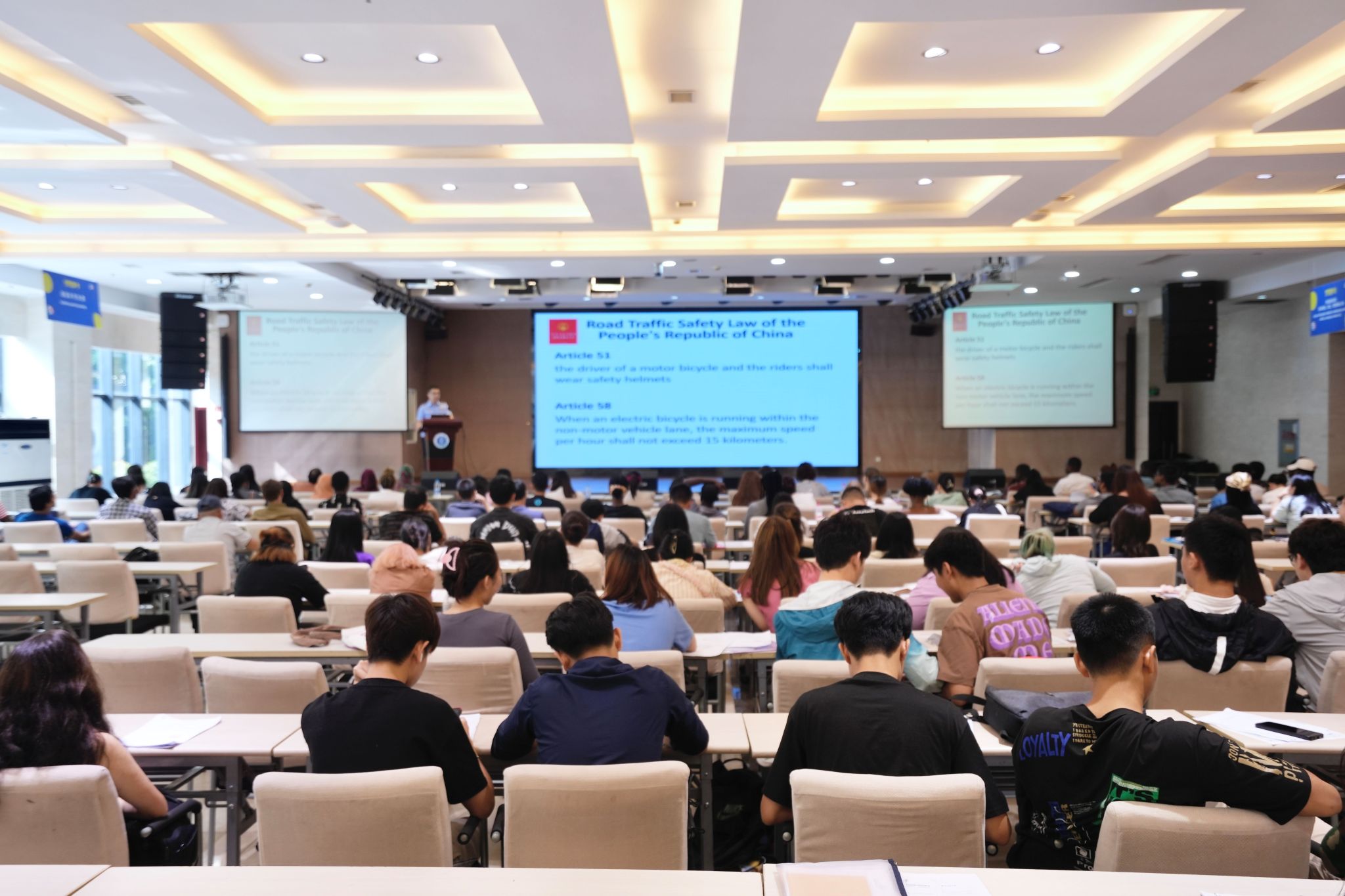 总队民警徐振芳从签证办理相关注意事项、外国人来华有关法律规定、非法打工、住宿登记等多个方面,仔细讲解相关法律法规,为全体来华留学生新生上了一堂严肃、有意义的法律课。