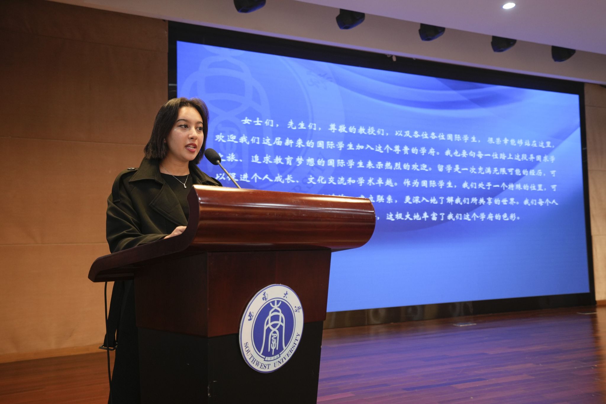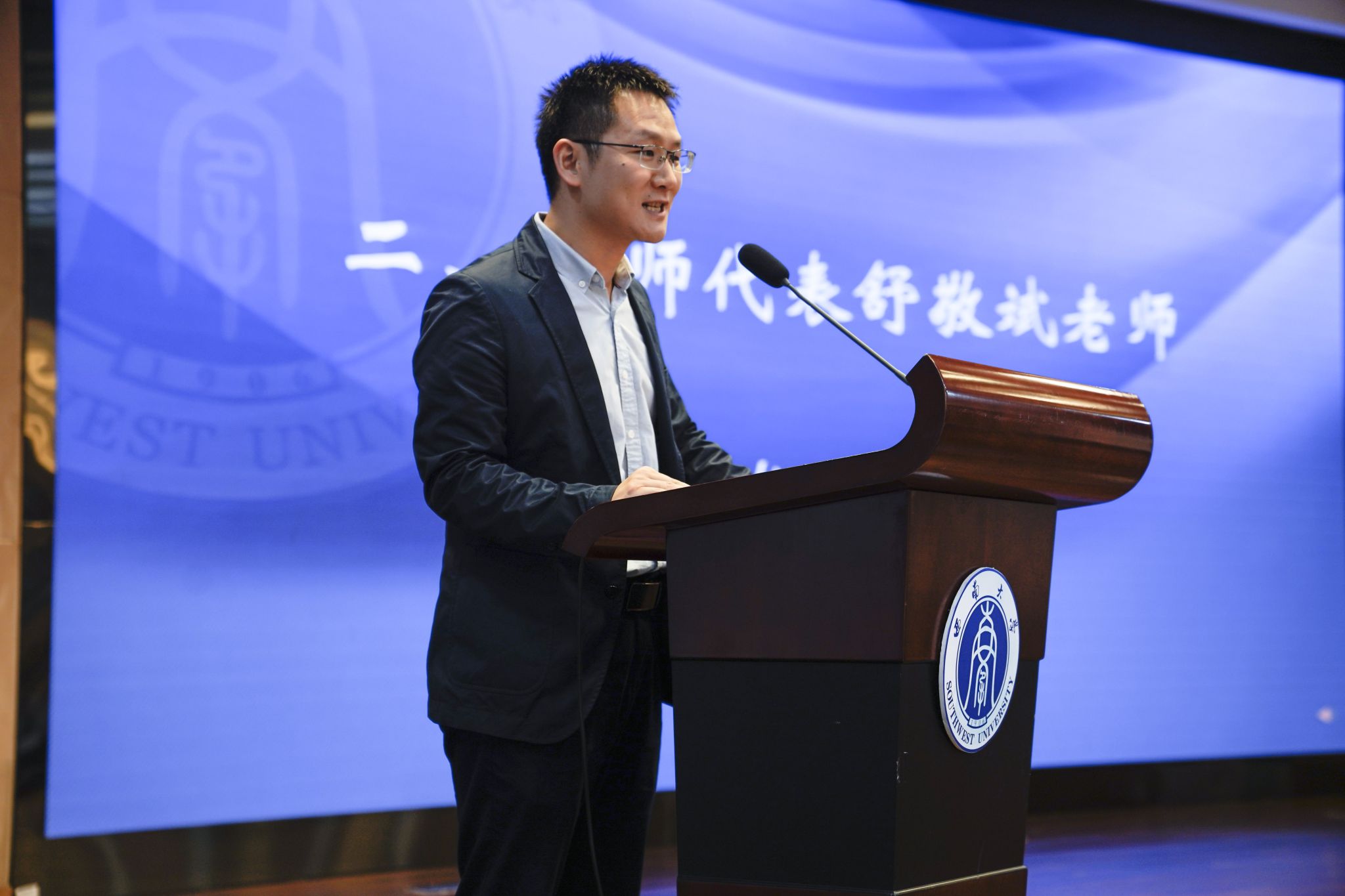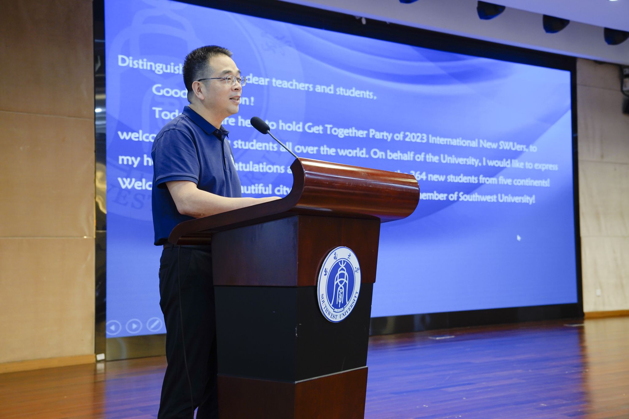 教师代表舒敬斌欢迎大家来到千里之外的家——西南大学,并以习近平总书记给留学生的回信鼓励新生探索真正的中国,促进各国民心相通,磨练自己成为想成为的人,学有所获、行有所成。