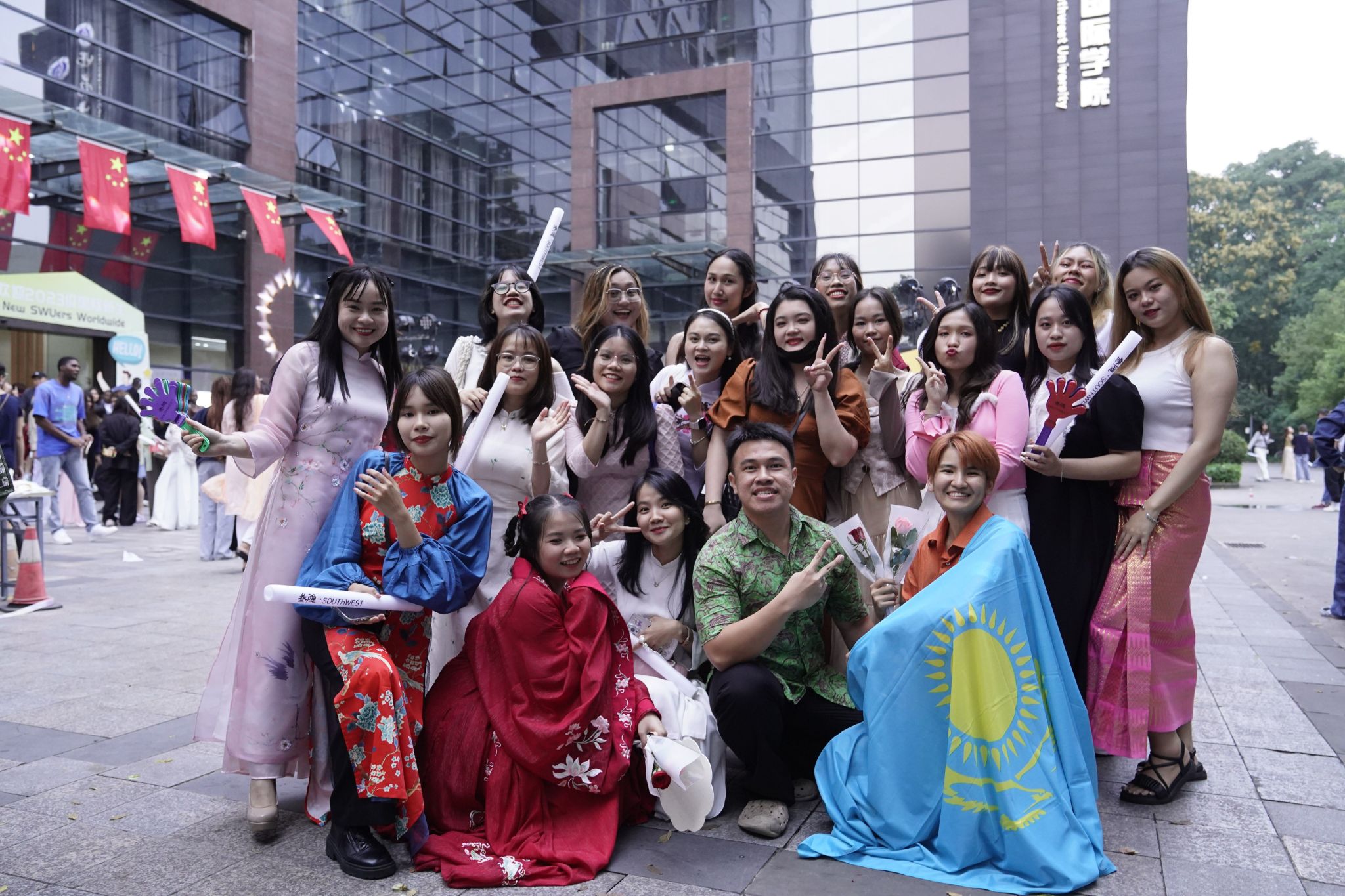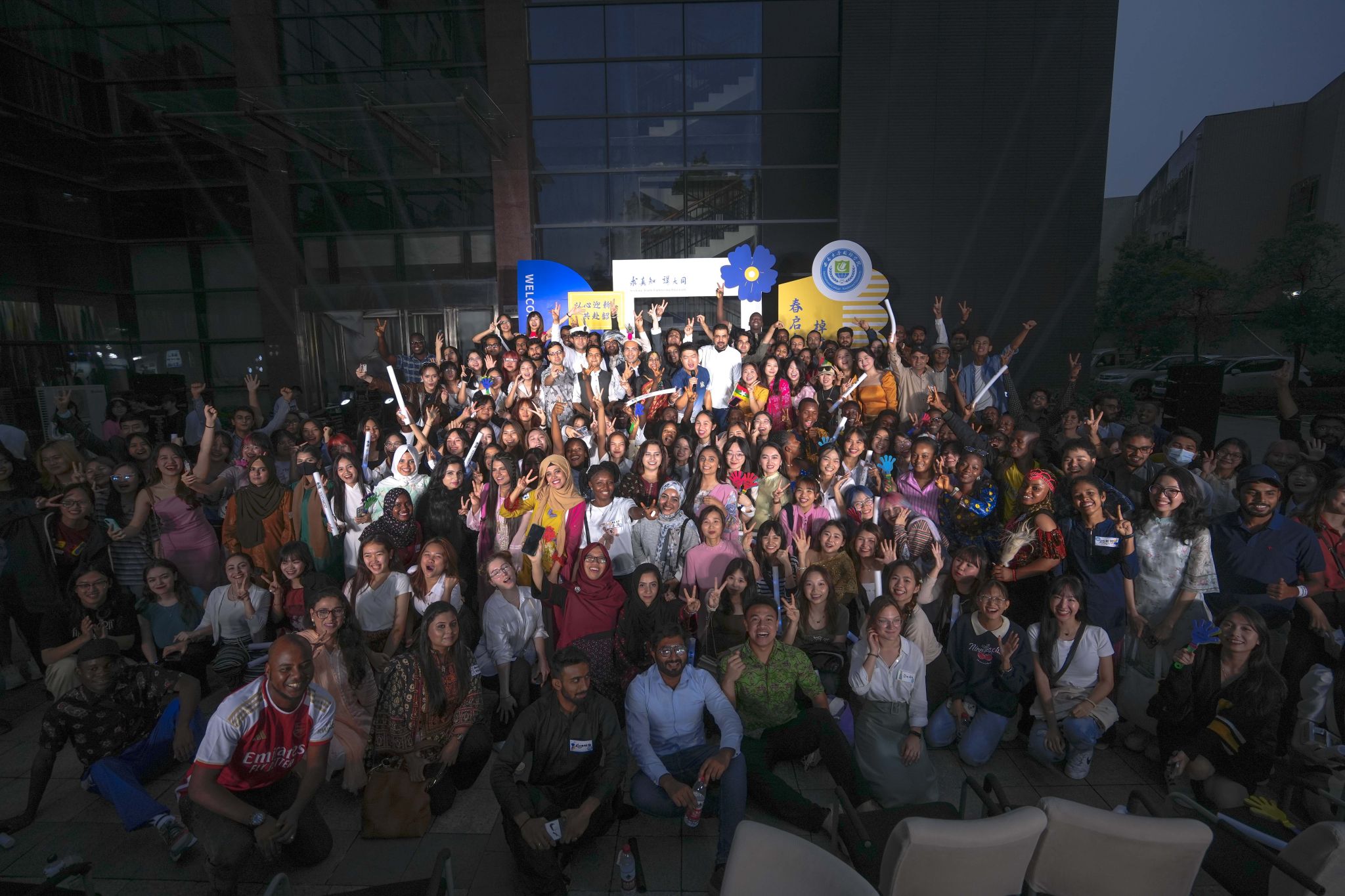 活动尾声,各国学生上台合影:穿着本国民族传统服饰的、身披国旗的、展示特色舞势的……多样化的合影方式体现了学校包容并蓄、以心迎新的办学态度。今后学院也将会继续陪伴大家共赴韶华,走向更好的自己。