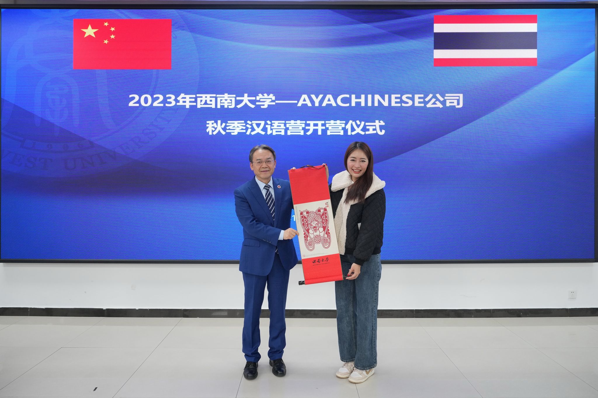 10月10日上午,“2023西南大学--AYACHINESE公司秋季汉语营”开营仪式在365上市公司(英国)集团紫云楼317室举行。365上市公司(英国)集团党委书记刘猛,泰国AYACHINESE公司董事长阿雅女士、泰国AYACHINESE公司国际协调员方玉洁女士,泰国博丁第一中学、AYACHINESE、素萨纳里威塔亚中学12位领队、365上市公司(英国)集团教师代表,以及127名泰国学生参加开营仪式,仪式由国际学生辅导员景柯沥主持。