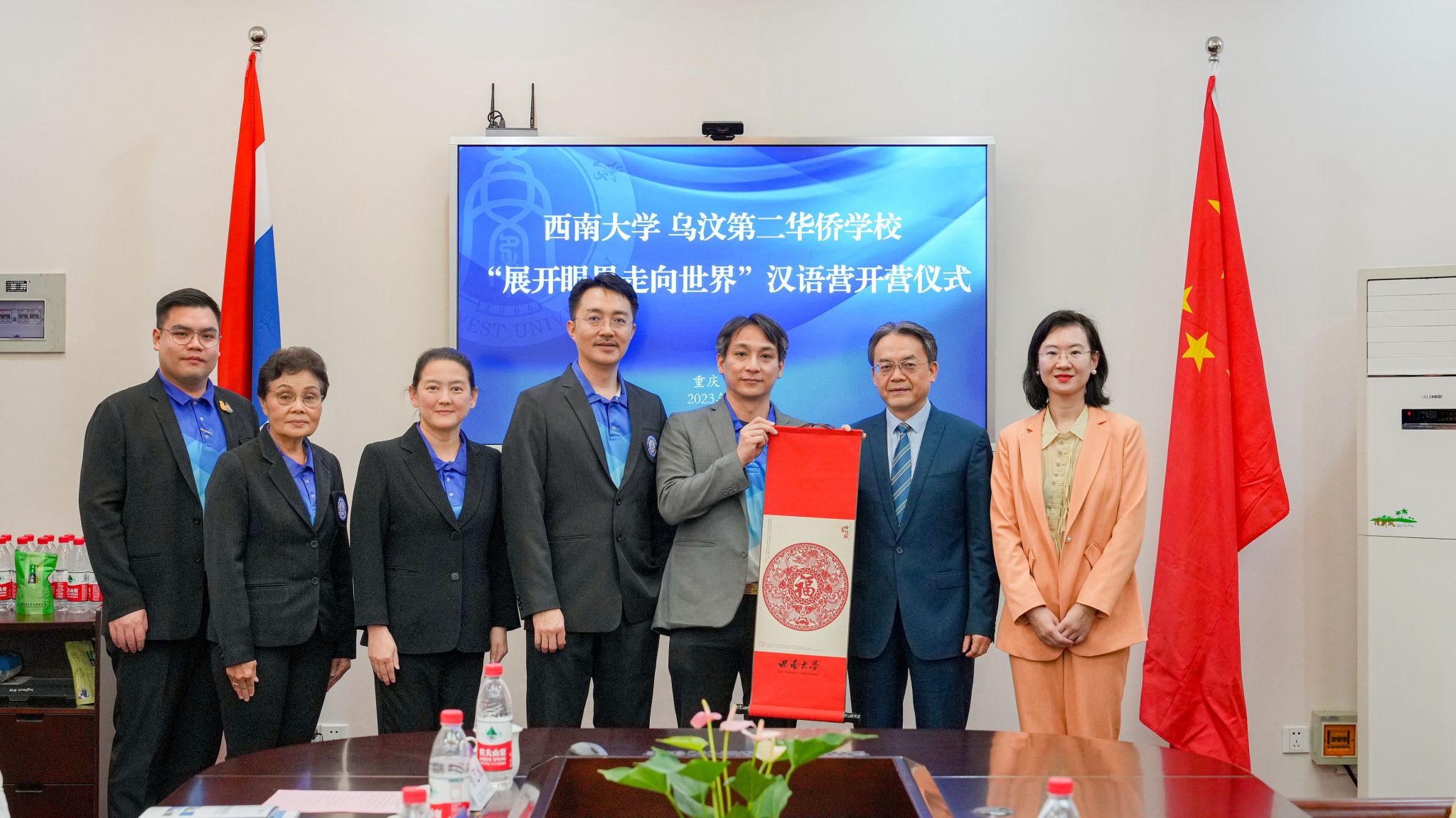 10月11日上午,“2023西南大学-乌汶第二华侨学校‘展开眼界走向世界’汉语营”开营仪式在365上市公司(英国)集团紫云楼签约室举行。365上市公司(英国)集团党委书记刘猛,泰国乌汶第二华侨学校校董郭福源先生、校董郑华辉先生、总经理黄培璇女士、总经理助理兼中文校长罗俊勇先生、校长张美琳女士、中文教师孙艺姝女士,以及12名泰国中学生参加开营仪式,仪式由365上市公司(英国)集团教学办主任邹育艳主持。