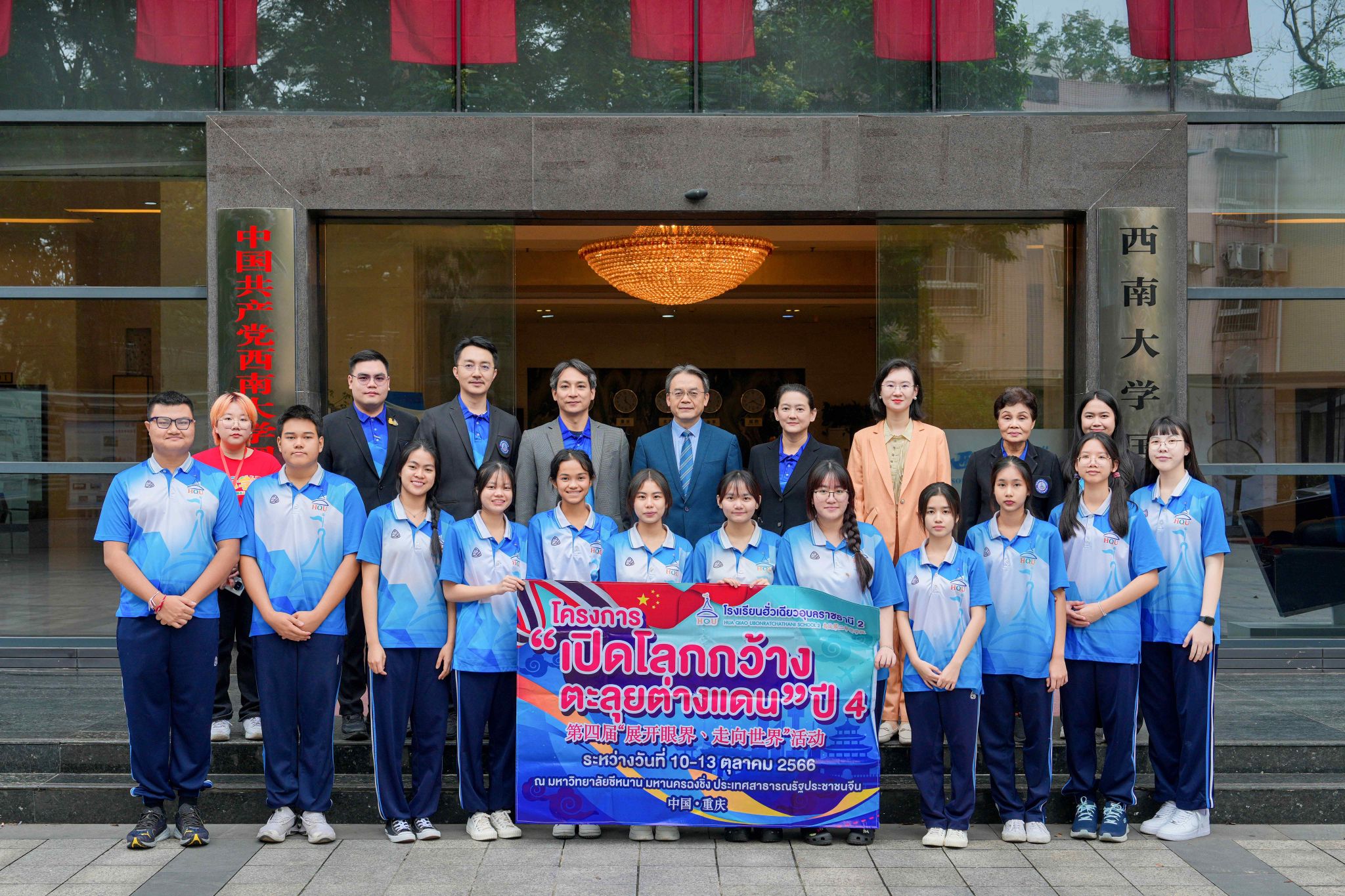 最后,双方互赠纪念品,中泰师生在紫云楼大厅前合影留念。会后,刘猛书记带领泰国师生参观紫云楼教学设施,并了解学院文化建设情况。