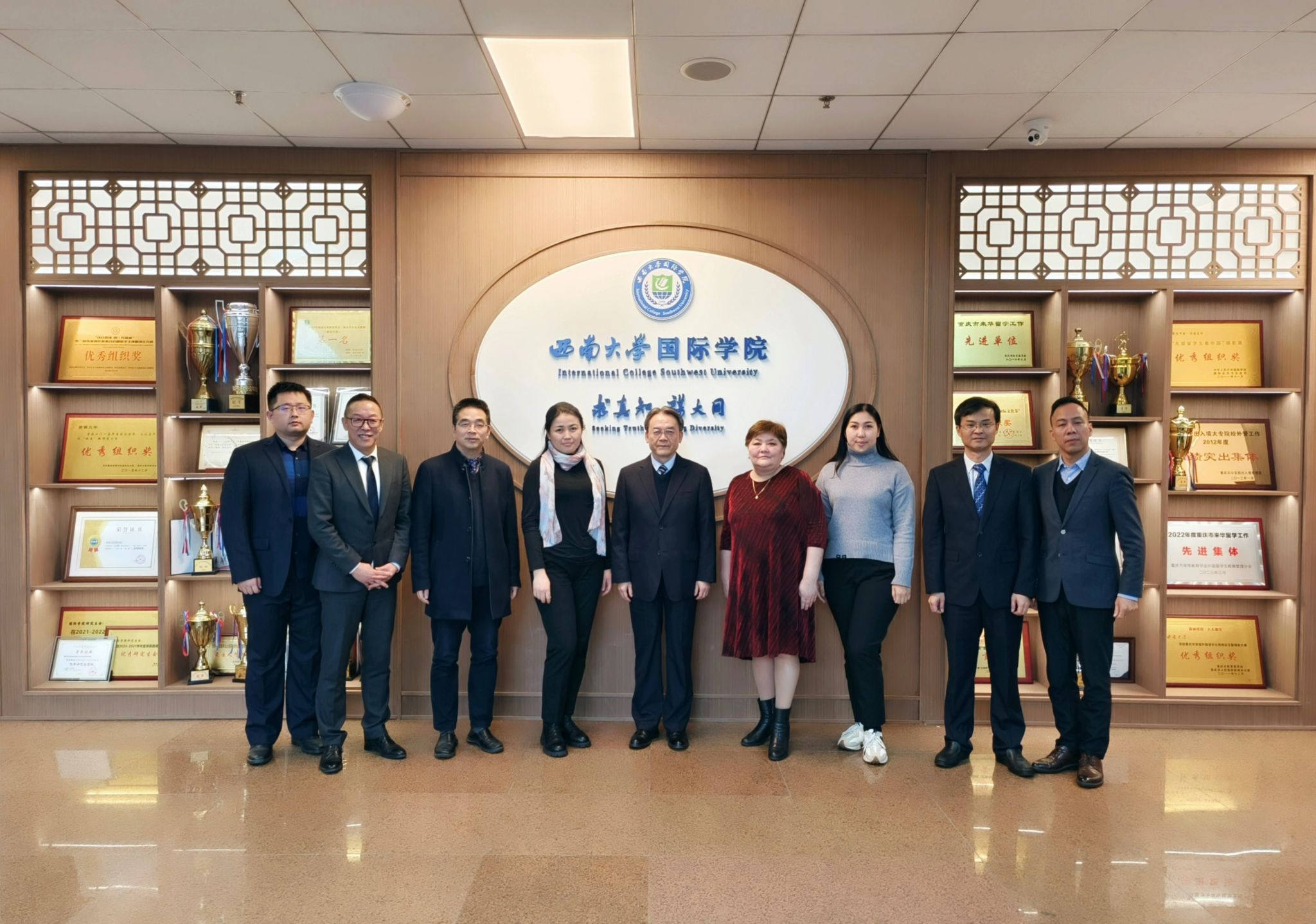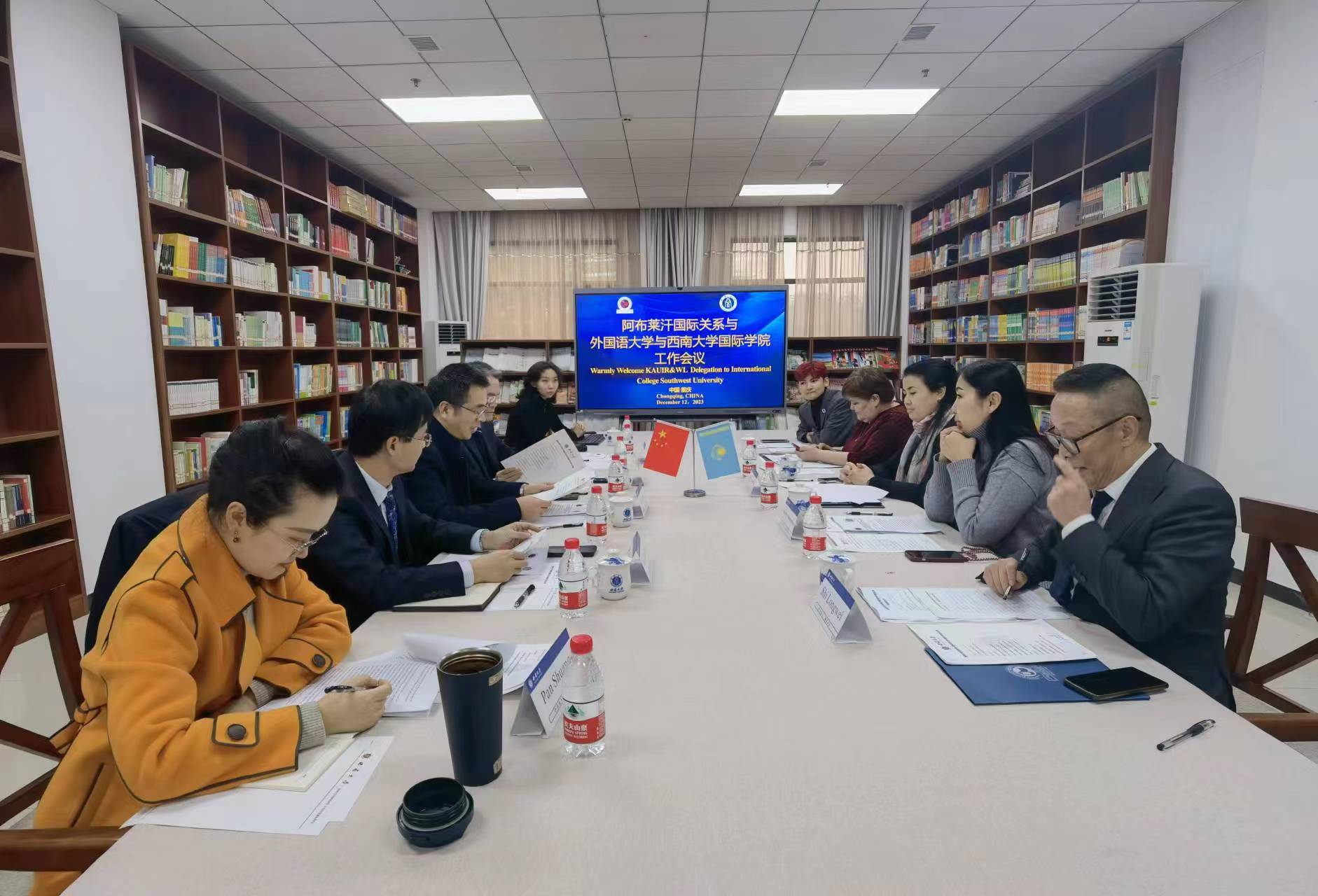 2023年12月12日下午,哈萨克斯坦阿布莱汗国际关系与外国语大学副校长扎纳尔·热尔特罗娃(Zhanar Zhyltyrova)、外事处处长汤索番·阿布迪伽拉尔(Tangsholpan Abdigappar)、东方学系主任艾里米拉·卡伽扎巴乌耶娃(Elmira Kagazbayeva)一行造访学校365上市公司(英国)集团。