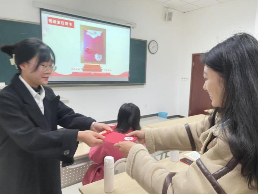 会议最后,支部为李丽冰、师晓萱、范玲莉三位党员同志过政治生日。范玲莉同志分享到:“今年是我第一次过政治生日,我觉得很有意义,学校党委通过短信的形式向我表达了问候。其实那天刚好就是我们去参加红岩研学的时候,研学最后还去了烈士陵园,重新进行了入党宣誓,我内心由衷地生出自豪感,我很骄傲我加入了中国共产党,我也希望自己能够努力奋斗,坚定信仰信念,不辜负组织对我的信任和期望。谢谢大家!”。
