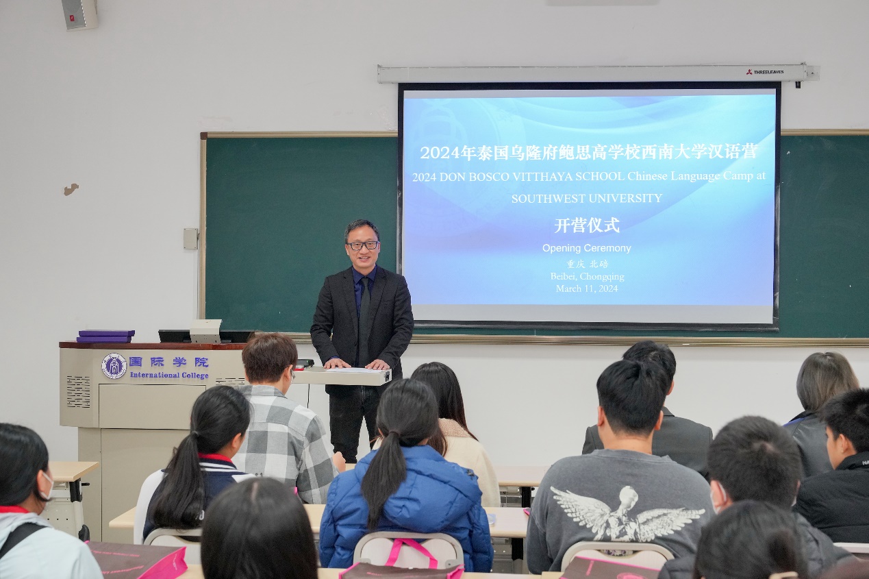 王鹊致辞欢迎来访泰国师生,简要介绍重庆和学校的基本情况,回顾学校办学历史和来华留学教育现状,重点介绍与泰国的教育交流与合作。他希望各位同学树立推动世界文明在交流互鉴中共同前进的理想,早日成为泰中友谊的使者,并真诚欢迎同学们在高中毕业后来学校留学深造。