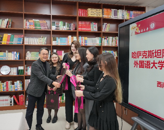 党委书记刘猛致辞,对10名交换生的到来表示热烈欢迎。他简要介绍重庆和西南大学的基本情况,回顾学校的办学历史和来华留学教育现状,以亲身经历重点介绍学校与阿布莱汗国际关系与外国语大学的交流与合作。他希望同学们树立推动文明交流互鉴的理想,祝愿大家在西南大学度过美好的时光。