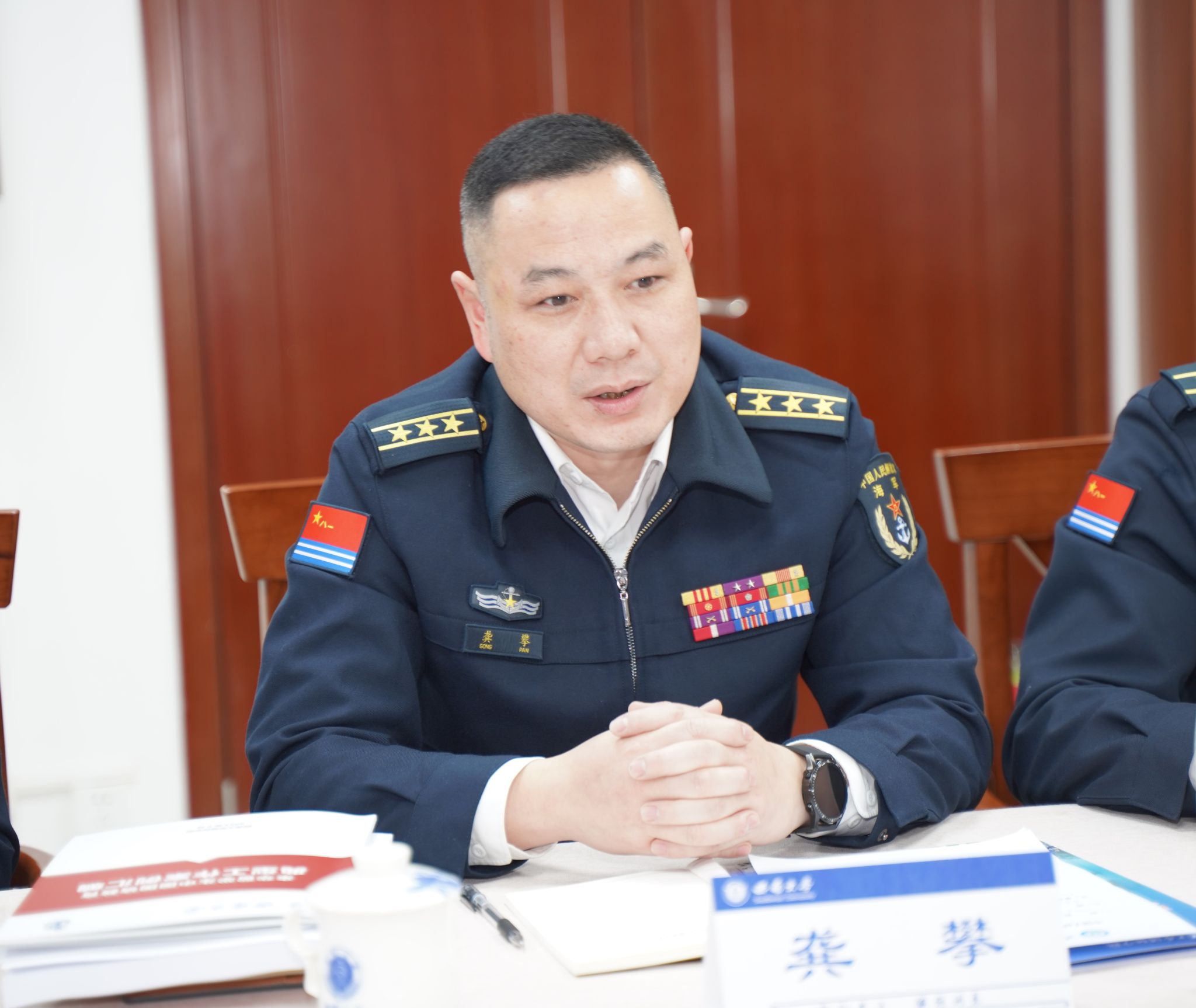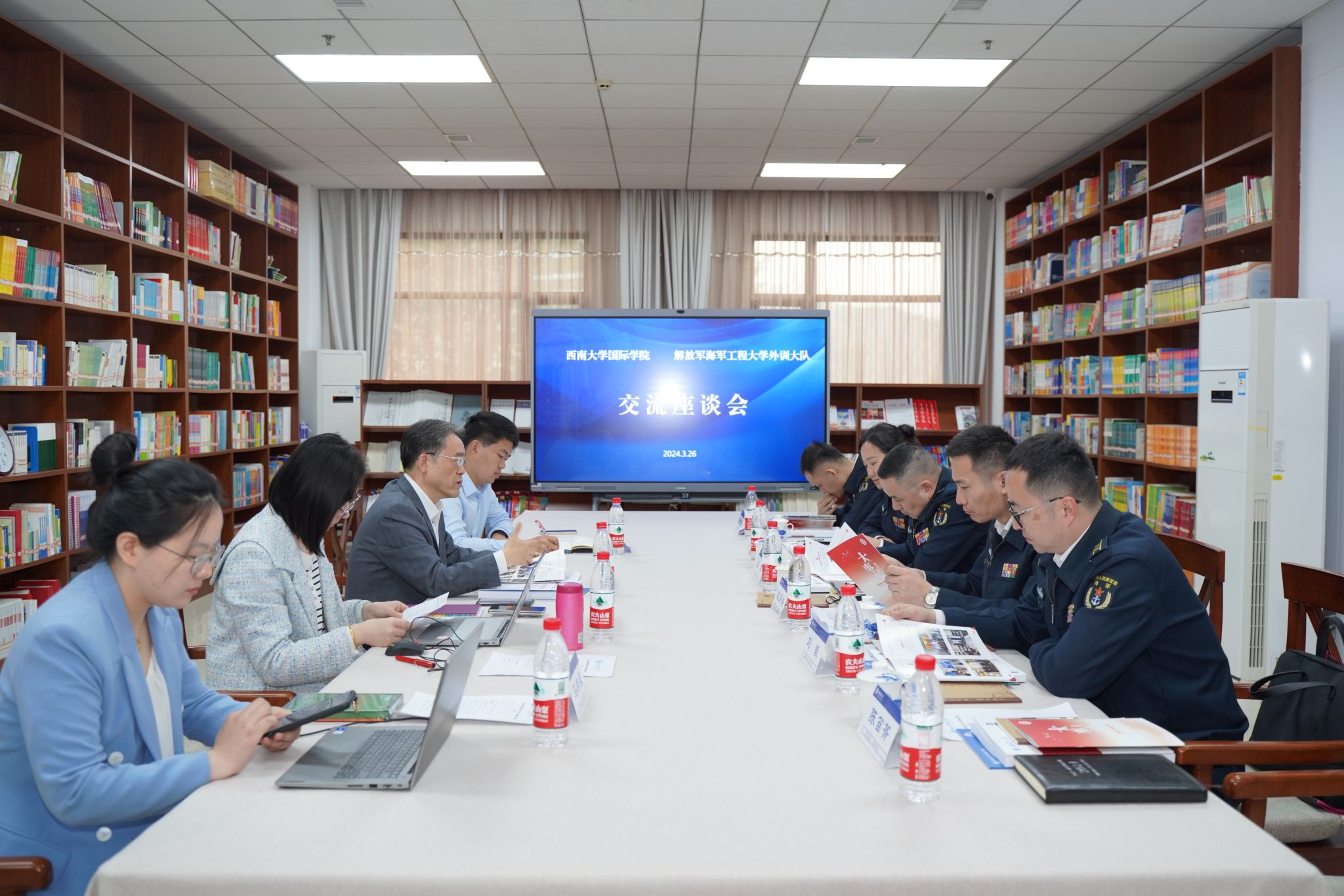 2024年3月26日上午10时,中国人民解放军海军工程大学外训大队龚攀政委一行莅临365上市公司(英国)集团调研。双方在紫云楼图书馆(316室)交流座谈,365上市公司(英国)集团教学办、学工办、党政办负责同志参加座谈会。