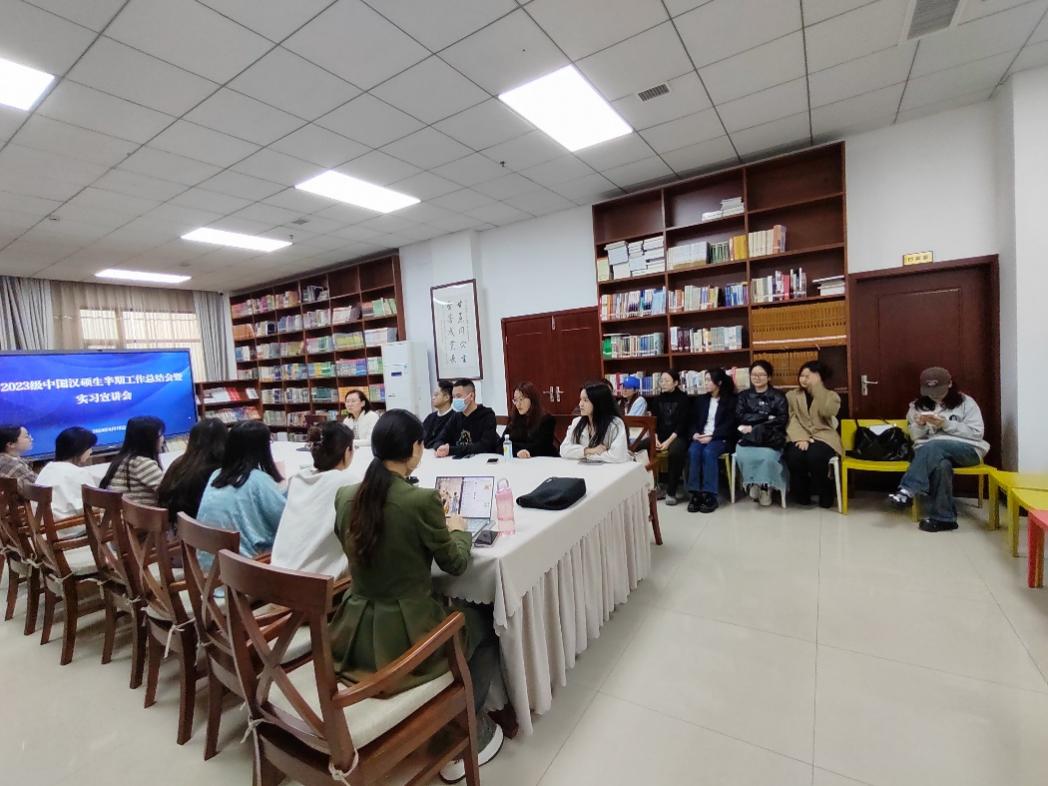 2024年4月10日下午3点,学院在紫云楼图书馆(316室)举办中期总结会暨实习宣讲会,教学办主任邹育艳,学工办主任杨昆,汉教系研究生教研室主任陈晨,2023级全体中国汉硕生参加会议。
