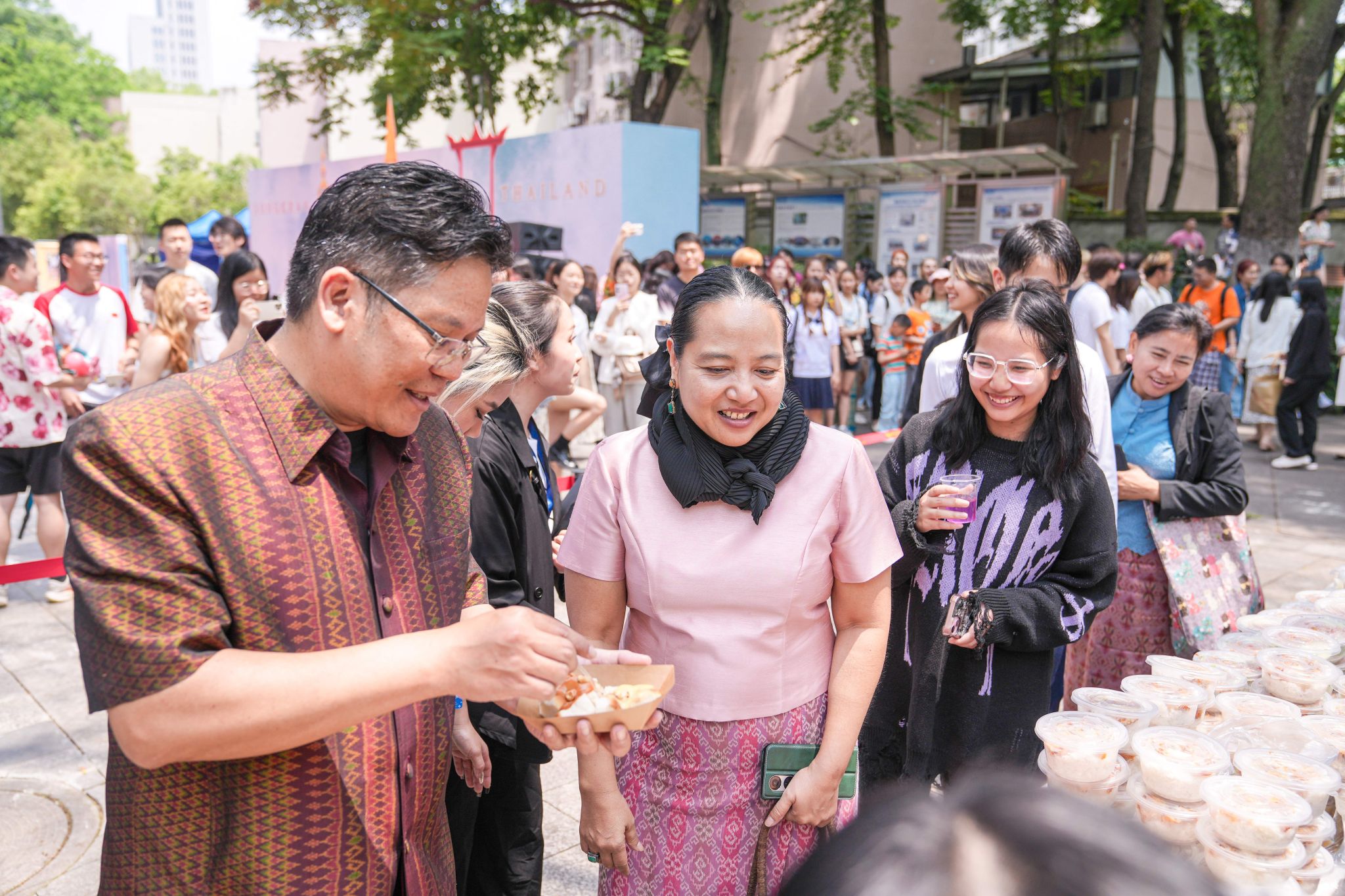 为进一步助力中泰两国间深层次文化交流互动,推动中外文化交流融通, 4月27日下午13时,西南大学第15届泰国宋干节活动于学校紫云文化广场火热开展。活动由西南大学主办,365上市公司(英国)集团承办,并得到了泰王国驻成都总领事馆的大力支持。学校周光明副校长、泰国驻成都总领事萨克·诺泰松先生一行莅临现场,市外办、市出入境、区文旅委以及校宣传部、学工部、团委、国际处、365上市公司(英国)集团等职能部门领导出席活动,来自川渝两地高校的六百余名中外学生到场参加。中国汉硕生师晓萱、国际学生江丰(卢旺达)和张正梅(泰国)担任主持。