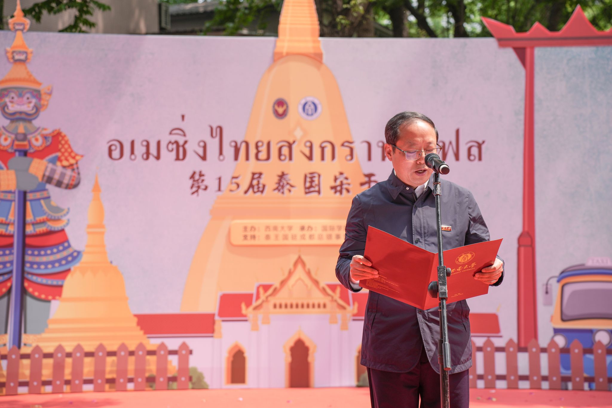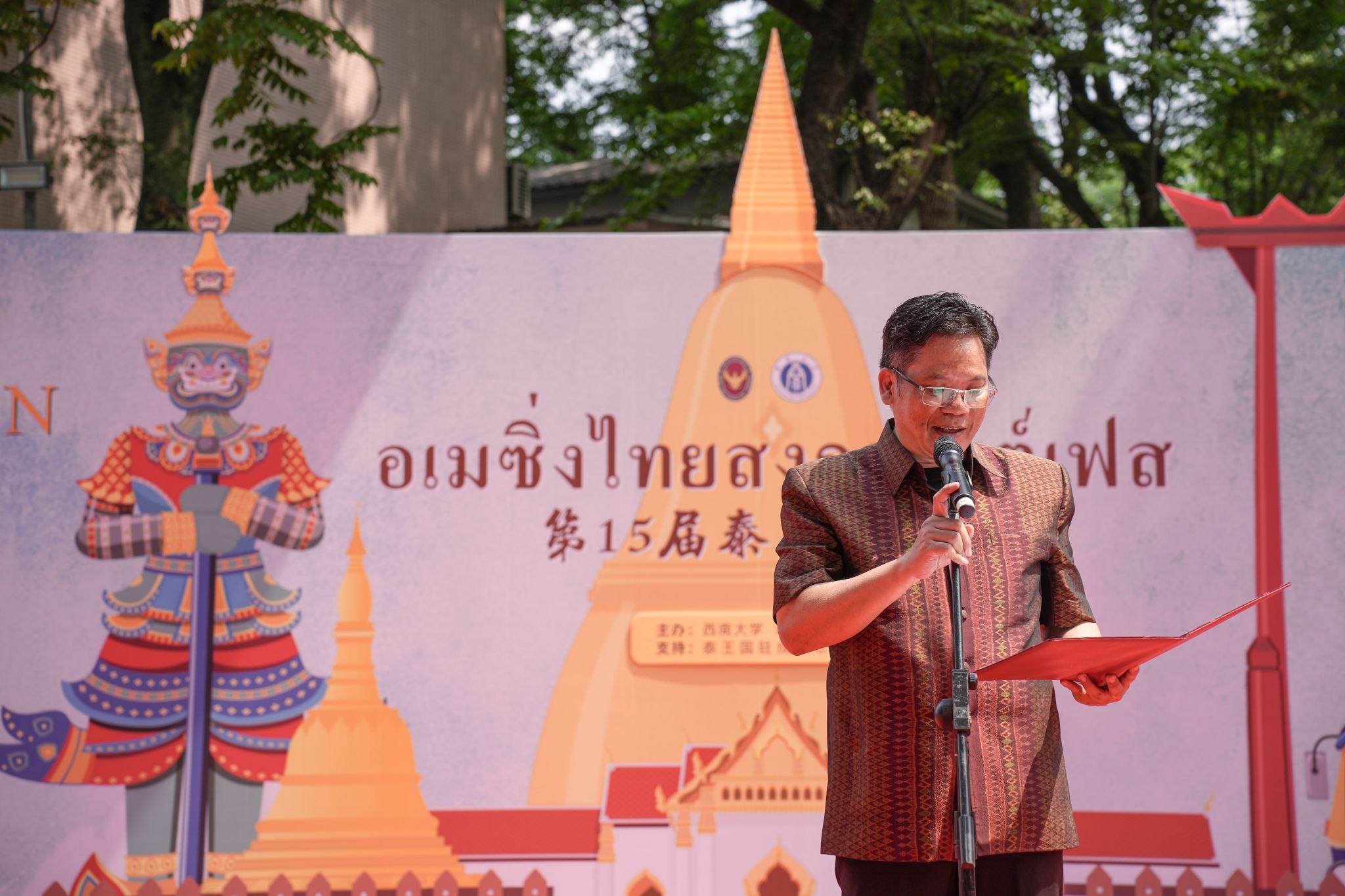 泰国驻成都总领事萨克·诺泰松先生致开幕辞,他表示在西南大学举办宋干节活动不仅是泰国传统的延续,也是一种对泰国传统文化的创造性保护和创新性表达,还是泰国留学生展现热爱传统、传承文化的责任感的良机,衷心感谢西南大学提供这一中泰文化交流的宝贵平台。
