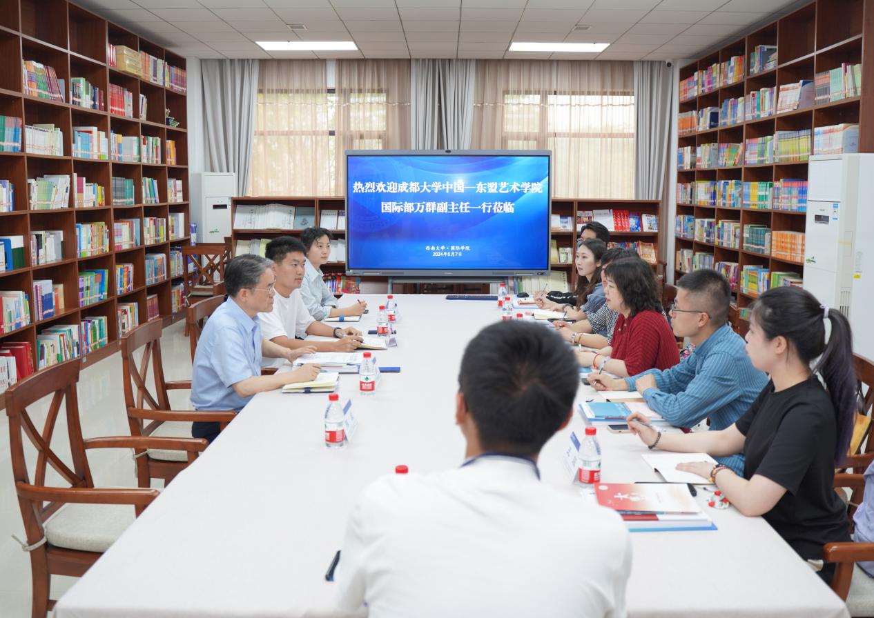 5月7日下午3点,成都大学中国-东盟艺术学院国际部副主任万群一行7人来学院开展调研。双方在紫云楼图书馆(316室)交流座谈,学院党委书记刘猛,学工办主任杨昆、研究生教研室主任陈晨参加座谈会。