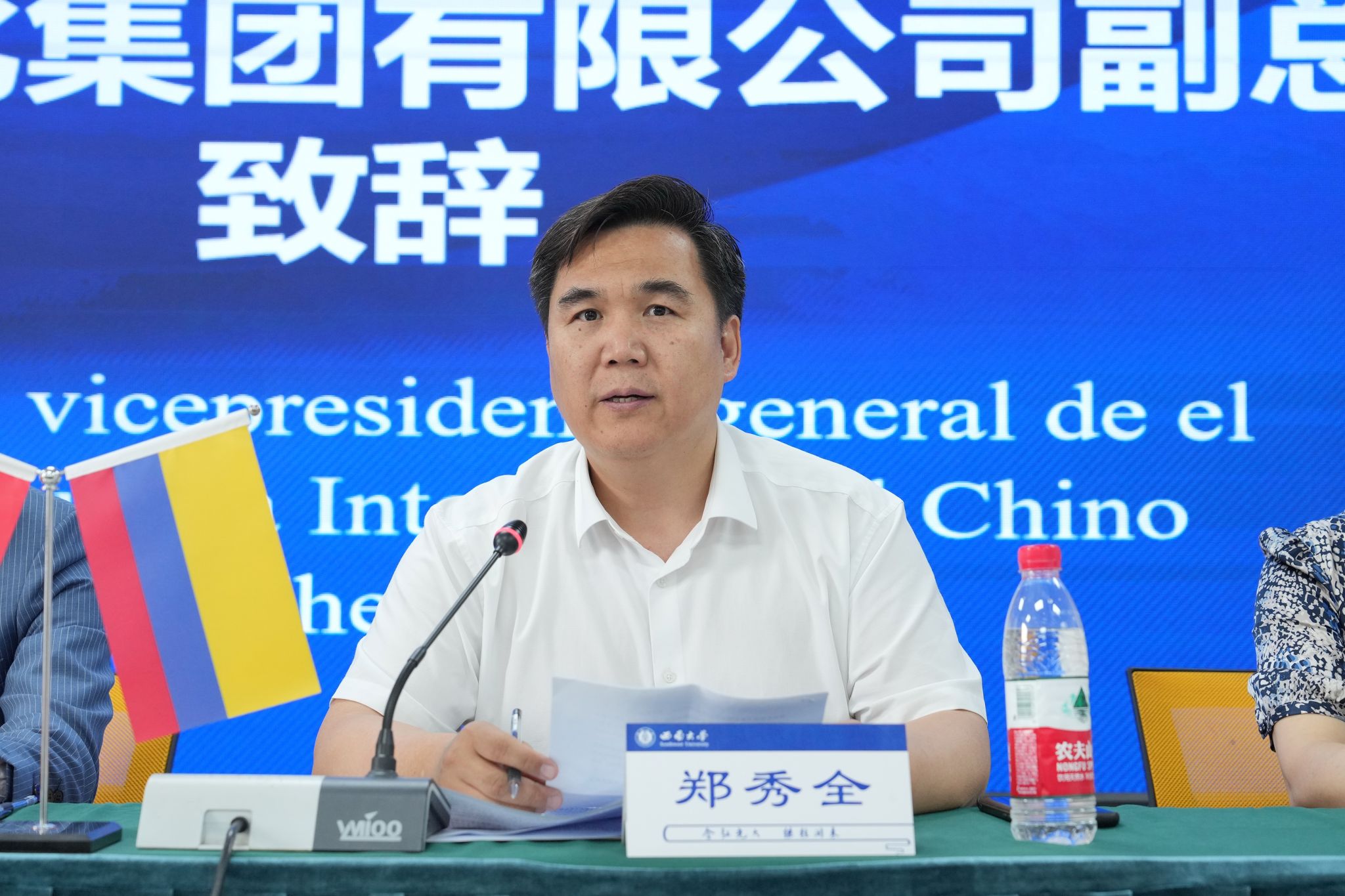中国对外文化集团有限公司副总经理郑秀全特别感谢西南大学对本次夏令营的高度重视,希望不远万里来到中国的哥伦比亚威尔蒙学校的师生们抓住难得的学习机会,尽享丰富的教育资源和深厚的学术底蕴。他表示中国对外文化集团有70多年从事对外文化交流的历史积淀,近年来,大力支持中外青少年间的学习交流,不断开拓帮助各国青少年学习了解中国文化,增进对中国的了解和友谊。相信在这里举办的中国文化夏令营,一定会取得圆满的成功。