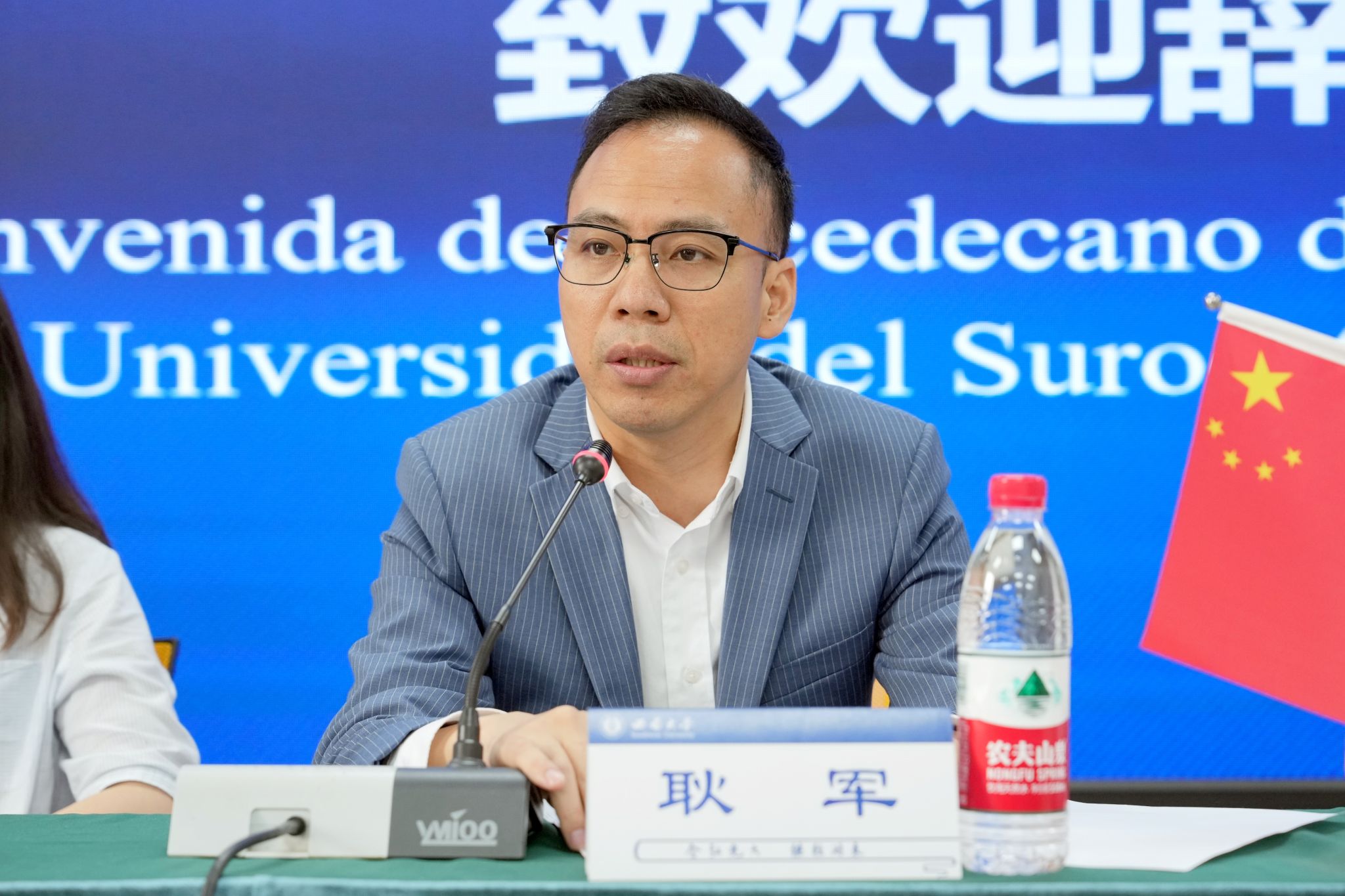 耿军副院长致欢迎辞,对哥伦比亚威尔蒙中学师生们的到来表示热烈欢迎。他简要介绍重庆和西南大学的基本情况,全面回顾学校来华留学教育历史和现状,重点展示学校国际学生丰富多彩的文化活动和社团发展。他希望各位同学把在中国游学的美好经历带回家乡,早日成为哥中友谊的使者,并真诚欢迎同学们在高中毕业后来西南大学留学深造。