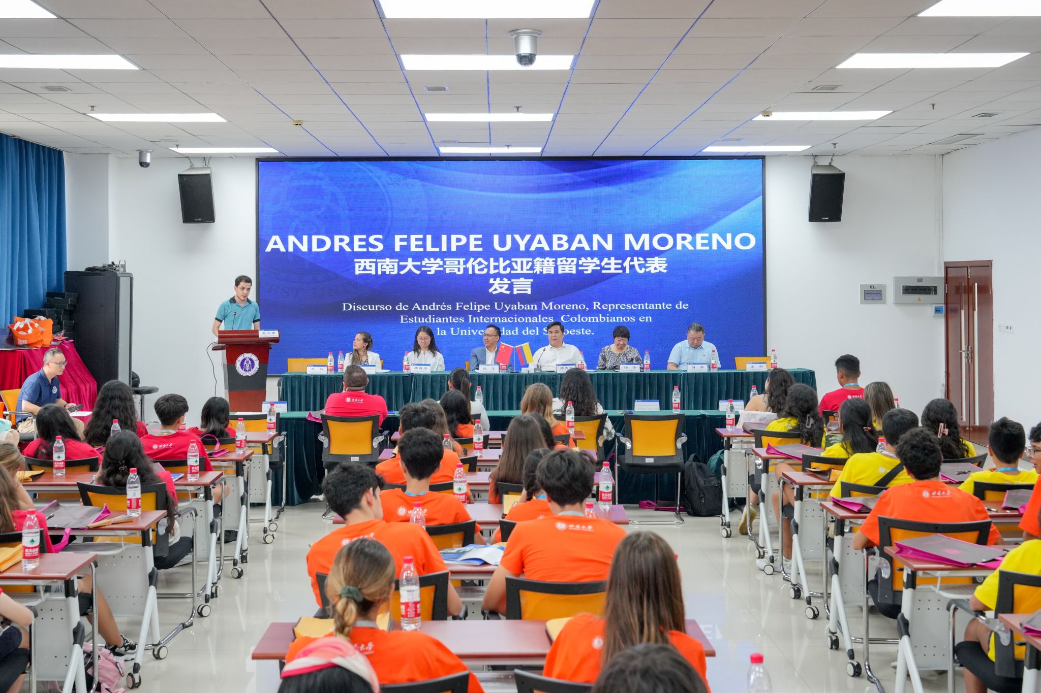 哥伦比亚籍中国政府奖学金获得者、教育学部硕士研究生Andres发言,他介绍了自己获得奖学金来华学习的经历和对学部、学校以及重庆的印象,鼓励大家争取同样好的学习机会,留学美丽西大。