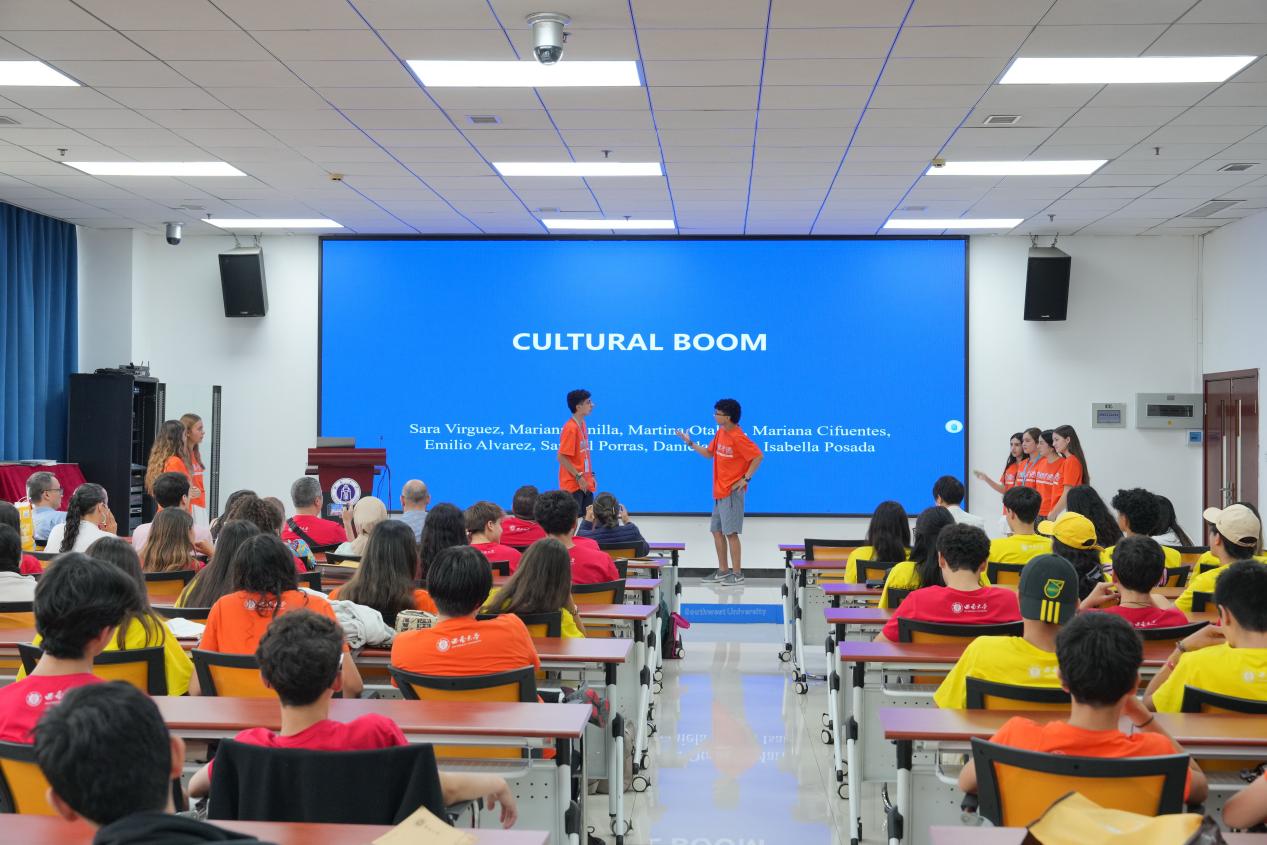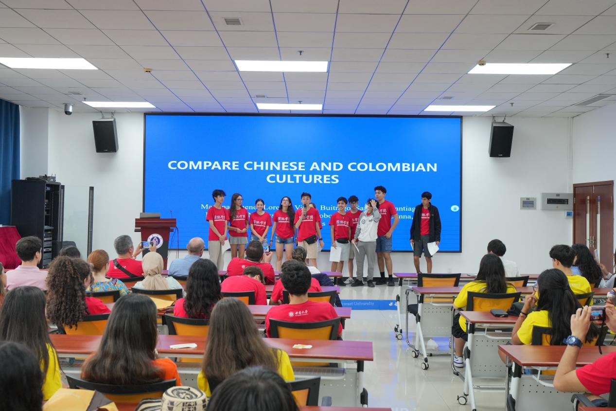 6月7日上午,学院在紫云楼317室举行“2024西南大学-哥伦比亚威尔蒙中学中国文化夏令营(A团)”闭营仪式。学院党委书记刘猛,威尔蒙中学副校长Pérez Rojas Carlos Esteban及8位教师和领队,中国对外文化集团有限公司文旅板块副总经理杨青,74名团员以及5名语伴志愿者参加仪式。仪式由招办王鹊主持。