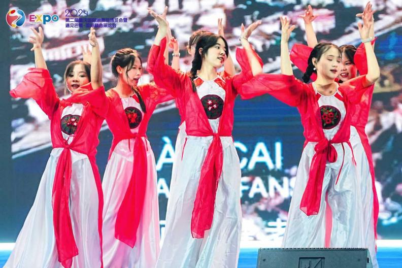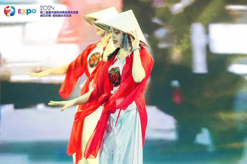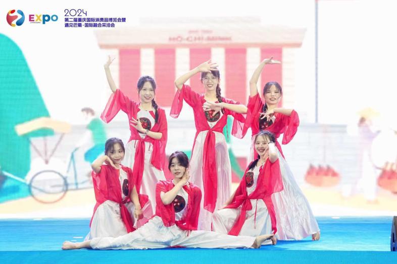 为了共同打造跨越国界的文化交流平台,展现全球文化的多样性和融合性,丰富展会内容,增进国际友谊,西南大学6名越南留学生受邀在展会启动仪式表演越南传统舞蹈《奥黛秀》。美妙的越南传统音乐配合着舞者翩翩起舞的身姿,使台下的观众都沉浸在留学生优美且具有独特风味的舞蹈表演中。表演结束后,台下爆发出热烈的掌声。