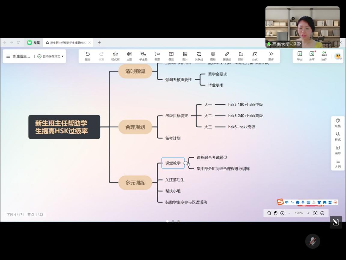 李丹以“如何提高学生HSK成绩”为主题,从HSK各类题型的考点要求和解题思路入手,分享了自己作为指导教师的经验和做法。她特别强调了跨学科融合教学的重要性,认为“各科教师应围绕提升学生中文综合应用能力协作,而非仅聚焦于HSK,综合提升学生语言能力”。冯雪作为新生班班主任,从HSK及HSKK对新生的重要性和必要性、大学四年考试规划及课堂内外多元训练三个方面分享了她的经验心得。舒敬斌作为大三年级班主任的代表,分析了该阶段学生面临的考试难度升级与要求变化,与教师们分享了包括课堂重难点突破、课后常规训练、个别针对精讲在内的一系列训练策略。陈婷婷作为毕业年级班主任,详细分析了本班HSK和HSKK通过率的原因,并详细介绍了她多年来针对HSK与HSKK考试所实施的系统性、计划性备考方案,为教师们提供了可借鉴的复习模板与实操技巧。