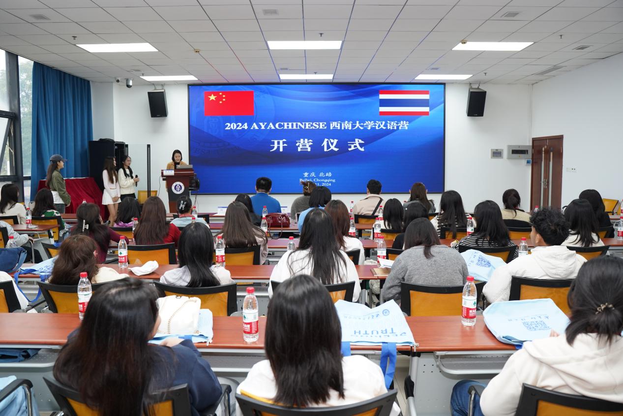 10月11日上午,“2024 AYACHINESE西南大学汉语营—A/B团”开营仪式在365上市公司(英国)集团317室举行。泰国AYACHINESE董事长阿雅女士、三位领队老师,365上市公司(英国)集团外国学生招生办公室主任黄无为、科员刘嬛,以及50名泰国学生参加开营仪式,仪式由刘嬛主持。