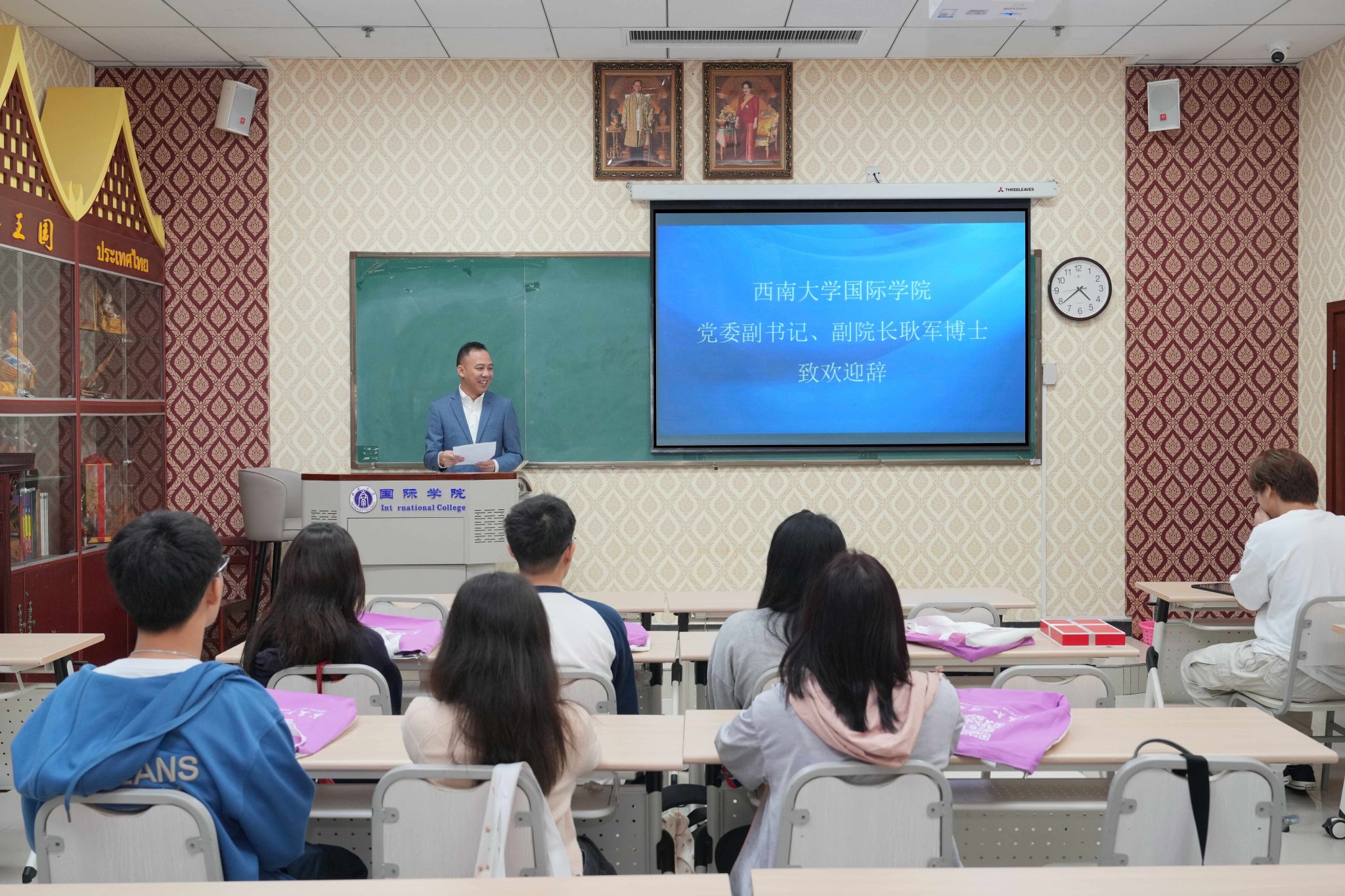 耿军副书记致欢迎辞,对来访泰国师生表示热烈欢迎,简要介绍重庆和西南大学的基本情况,回顾学校办学历史和来华留学教育现状,重点介绍与泰国的教育交流与合作。希望各位同学树立推动世界文明在交流互鉴中共同前进的理想,早日成为泰中友谊的使者。真诚欢迎同学们在高中毕业后来西南大学留学深造。