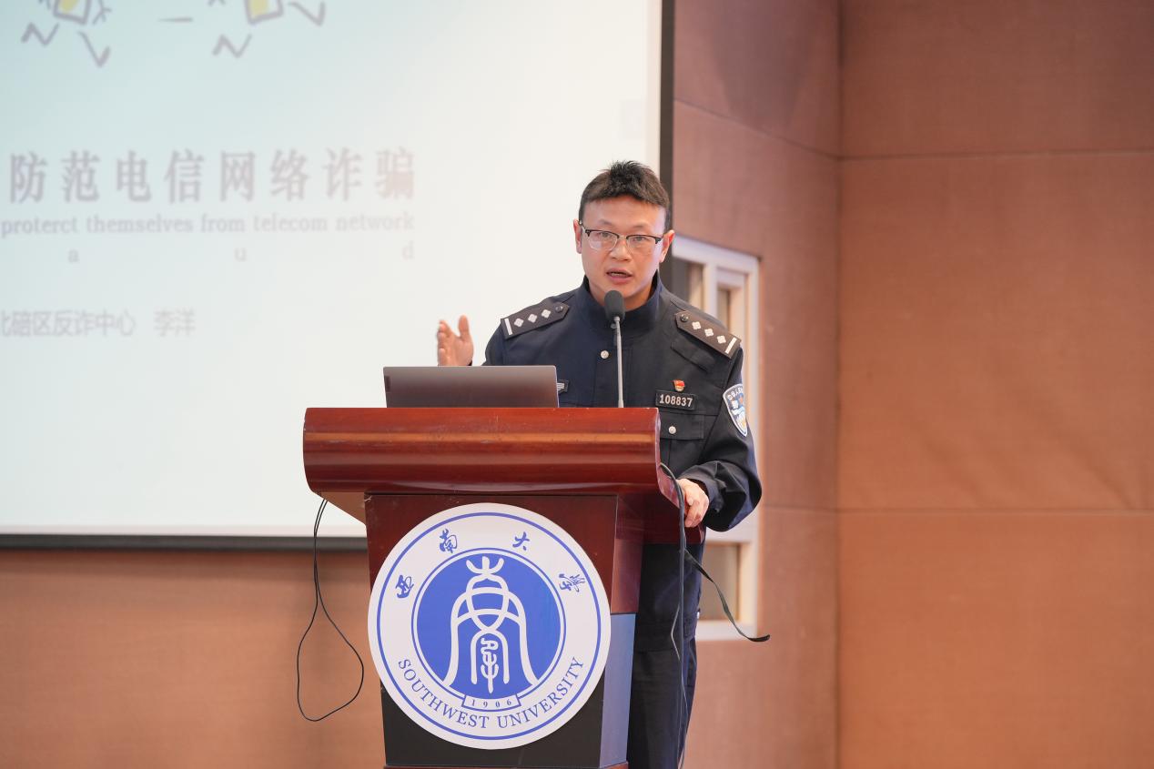 北碚区反诈中心李洋警官则以“大学生如何防范电信网络诈骗”为主题,为同学们上了一堂生动的反诈公开课。李警官用反诈宣传视频作为开场,引发学生思考如何反诈,再结合近期发生的真实案例,详细分析了电信诈骗的常见形式及特点。随后,李警官设置了多个互动环节,引导学生共同总结出防范建议,输入与输出并行。同学们积极参与,进一步了解了如何识别诈骗、保护个人信息,大家纷纷表示受益匪浅。