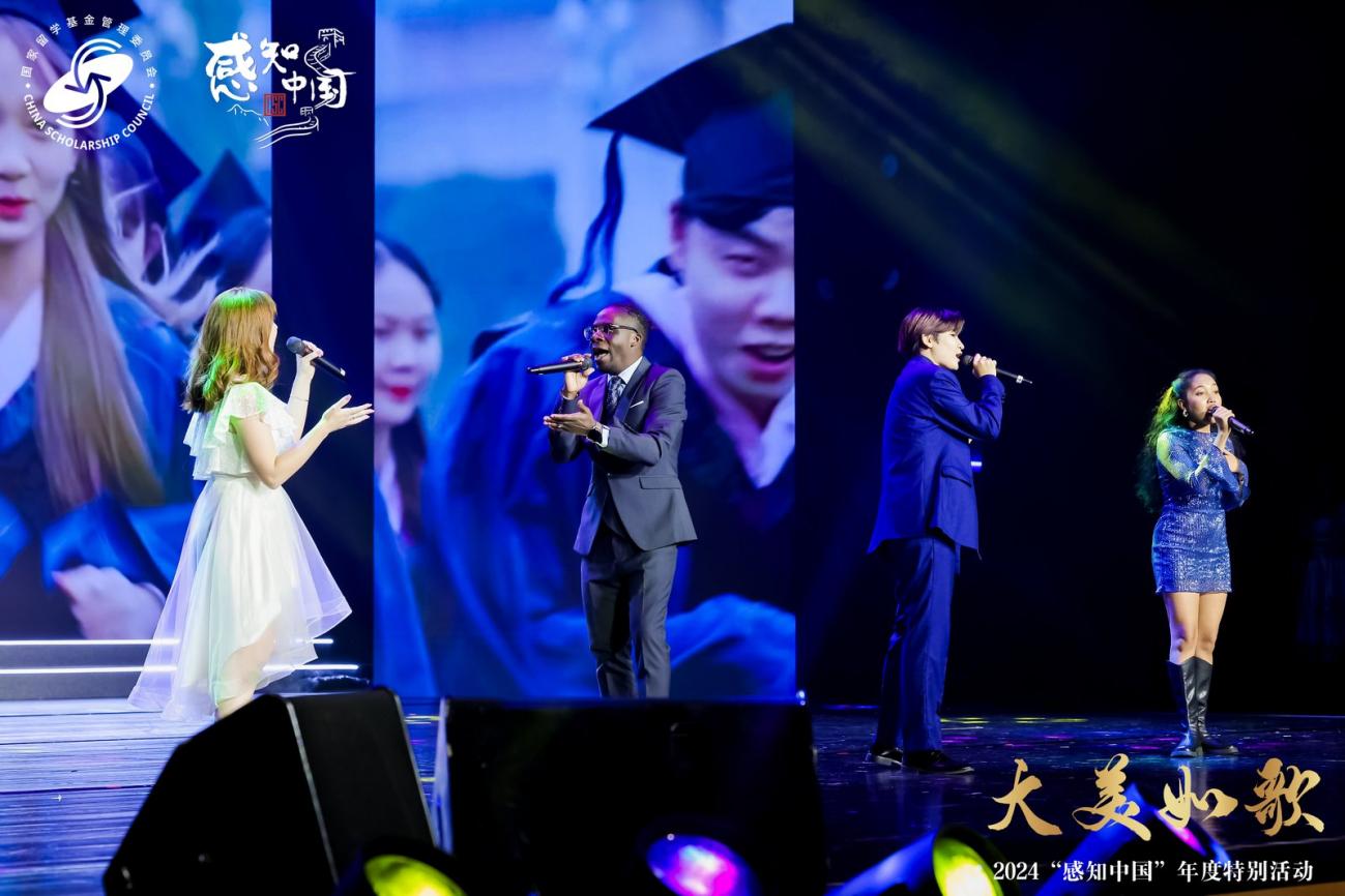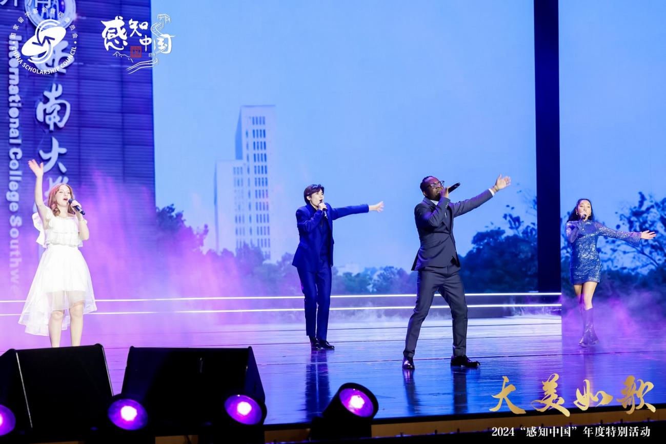 活动在2024年“感知中国”回顾视频中拉开帷幕。来自北京大学、清华大学、复旦大学等15所高校的中国政府奖学金生代表通过演讲、情景展示、歌舞等形式分享了他们参加“感知中国”活动的收获和体会。学校赞比亚籍国际学生GIFT MUYUNDA(格福特)携手来自意大利的CATERINA CAZZOLA(左拉)、马达加斯加的ANDRIANJATOVO MIRAY FIFALIANA MIARIMBOLA(梦蝶)和哈萨克斯坦籍的AINURA KUBENOVA(刘月光)共同演唱其原创歌曲《Joining Hands》(《携手并肩》)。这首歌曲以其独特的旋律和深情的歌词,表达国际学生对中国的热爱和对世界和平、共同发展的美好祝愿。