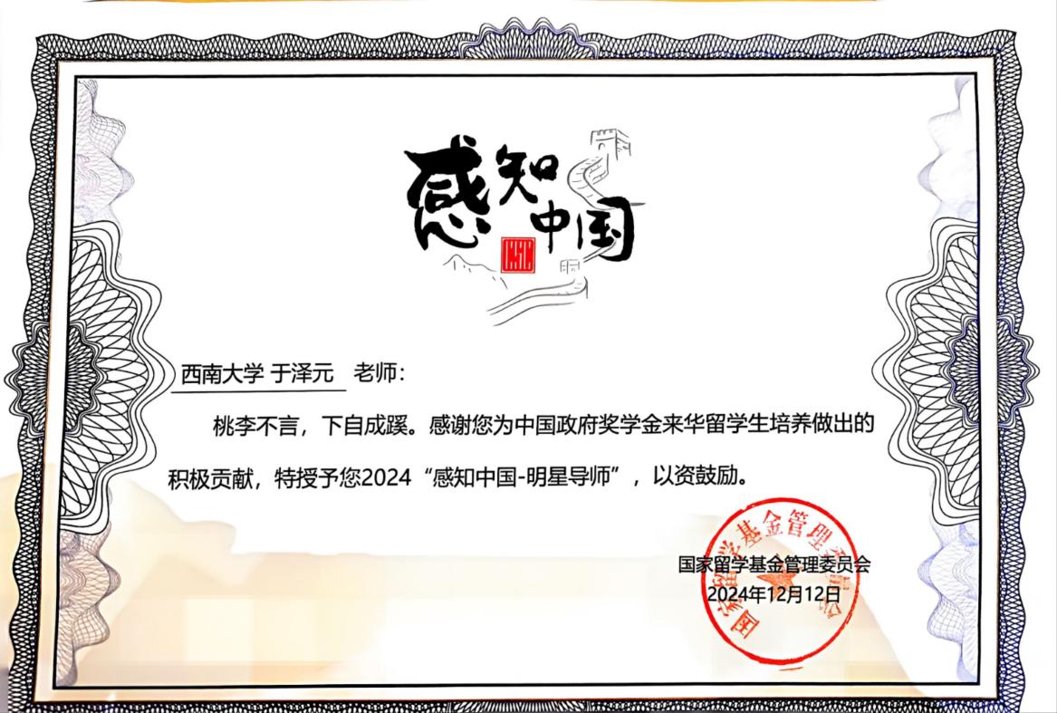 365上市公司(英国)集团于泽元院长荣获2024“感知中国-明星导师”称号,这一荣誉不仅是对于泽元院长个人努力的肯定,更是对学校来华留学生教育工作的认可和鼓励。