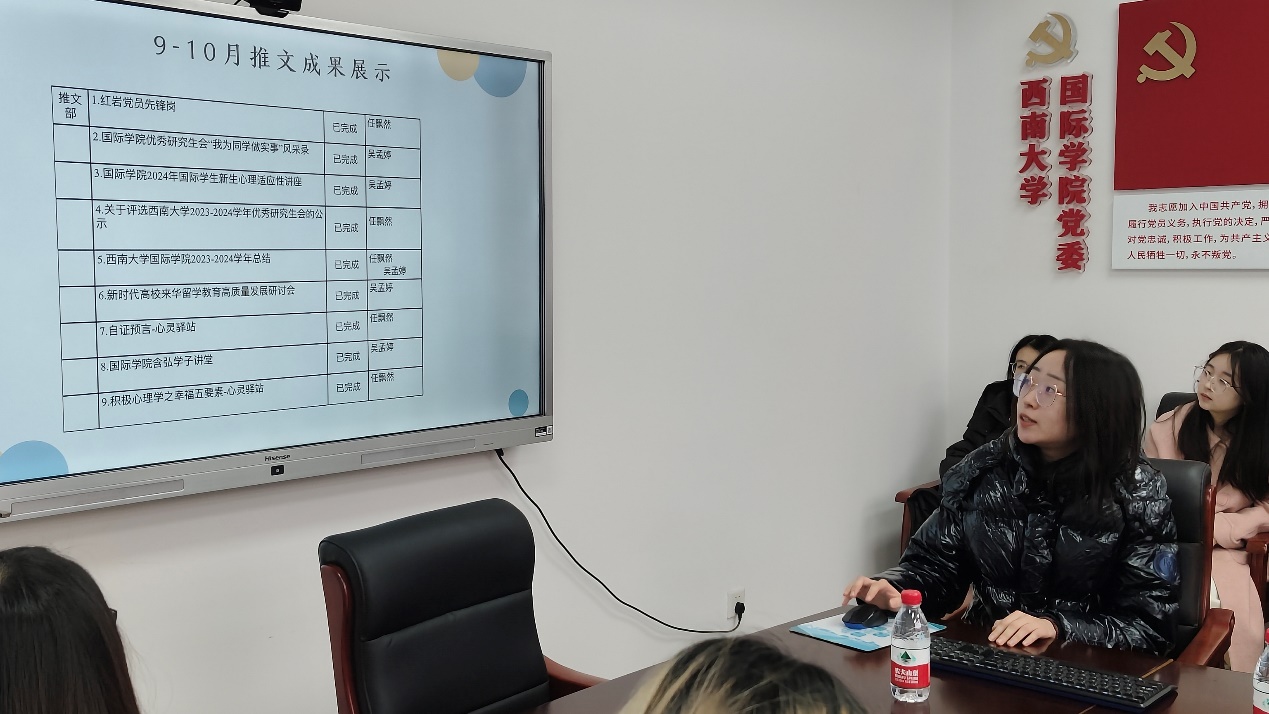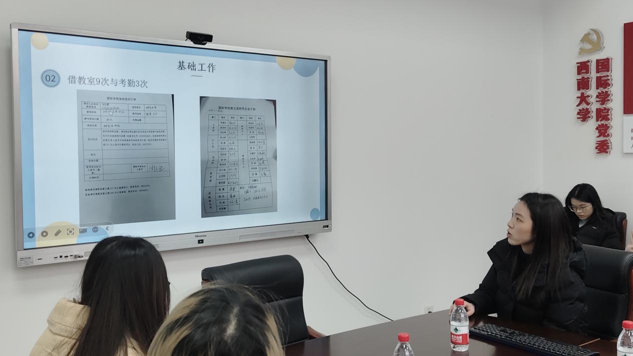 融媒体中心负责人覃苗和傅晓晨回顾了融媒体中心9月至12月在视频拍摄与剪辑、活动推文发布、活动策划及海报制作等方面的工作成果。同时,也对工作中的不足进行了反思,并对未来的发展方向作出了规划,力求在创新与执行力上不断提升。