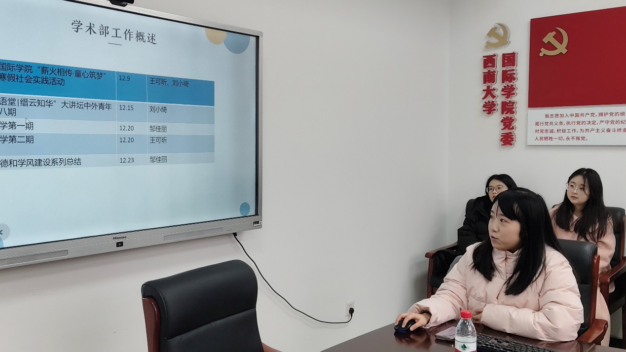 学术部负责人刘小绮对本学期的工作进行了总结,重点介绍了围绕科学道德与学风建设开展的活动及“紫云研学”系列文章的发布,展现了学术部在营造良好学风氛围的积极作用。她表示,学术部将坚持“固本拓新”的理念,不断优化工作规划和活动安排,为学院学生打造更优质的学术环境。