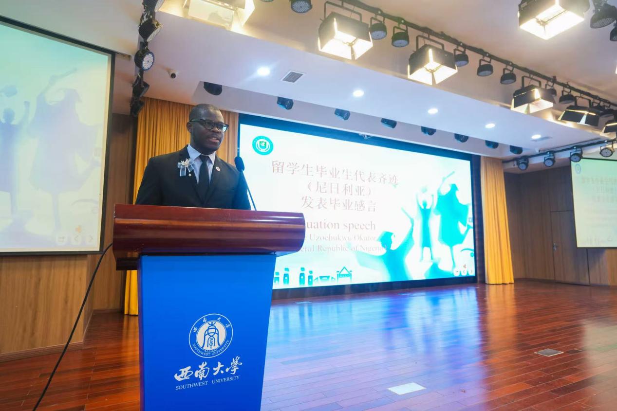毕业感言环节,中外毕业生代表王昕与齐迹接力诉说。在他们的发言中,既有初进校园时的忐忑不安,更有在包容氛围里破茧成蝶的蜕变,句句真挚话语,道尽学生与西南大学双向奔赴的珍贵情谊。