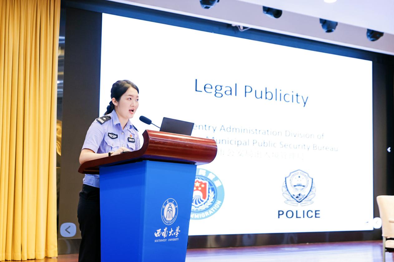 为帮助2025级国际学生新生更好了解中国相关法律法规及签证政策,顺利开启在华学习生活,2025年9月12日,学院特邀重庆市公安局出入境管理局境外人员管理支队领馆大队舒林大队长一行来校,为全体新生举办了专场法律法规宣讲会,并进行现场签证面签工作。