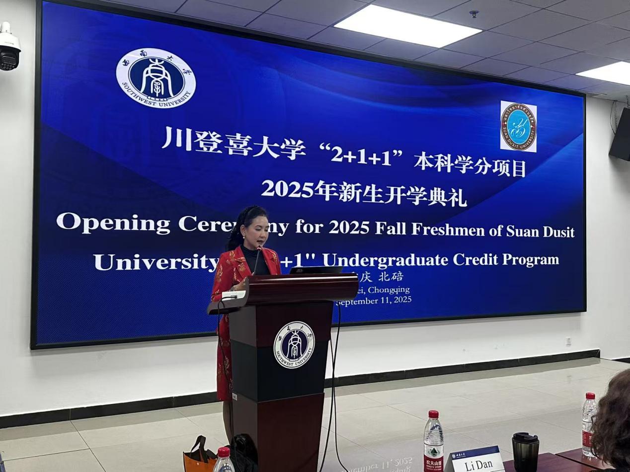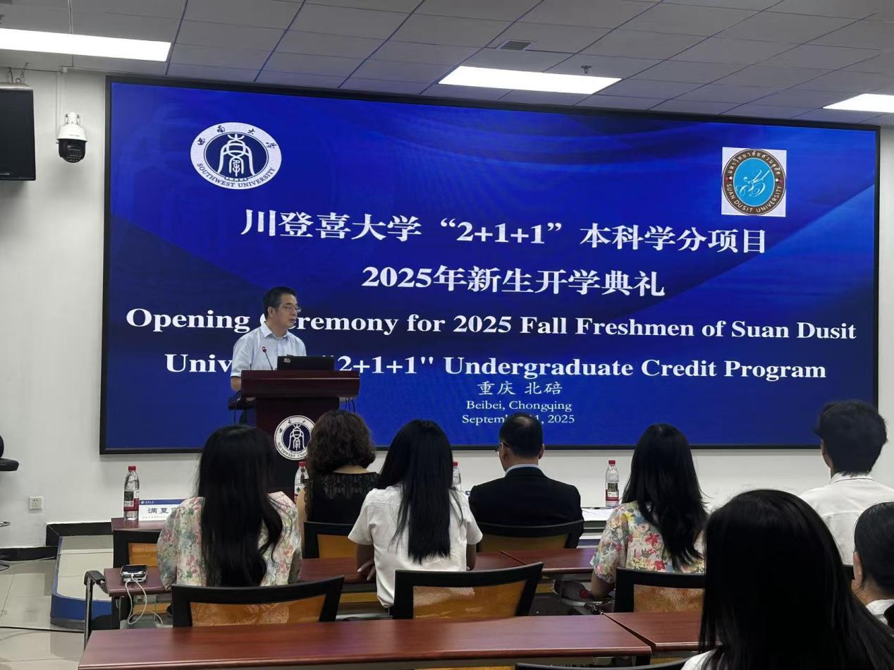 于泽元院长首先致辞。他指出,川登喜大学2+1+1学分本科项目是两校经反复研讨打磨,创新性地构建了“2年川登喜学习+1年西南大学学习+1年川登喜学习”的分段培养模式。为保障学生在西南大学阶段的学习体验,学院已组建专属教学与服务团队,将通过定制化课程衔接前序学业、全方位生活帮扶、丰富文化交流活动,助力学生夯实专业基础、拓展国际视野。同时,于院长对新生提出三点期许:珍视学分机会,确保各阶段学业无缝衔接;拥抱跨校体验,在中泰文化交融中提升综合素养;扛起首批学生的责任,为项目发展积累宝贵经验,成为中泰教育合作的“见证者”与“推动者”。