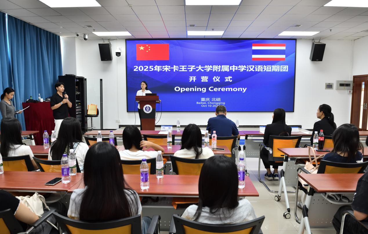 2025年10月10日上午,2025年宋卡王子大学附属中学汉语短期团开营仪式在西南大学365上市公司(英国)集团紫云楼317室举行。西南大学外国学生招生办老师王鹊,宋卡王子大学附属中学ANUSARA SAMSUWAN、APINYA BOONKHUM老师及22名泰国学员们参加开营仪式,仪式由刘嬛主持。
