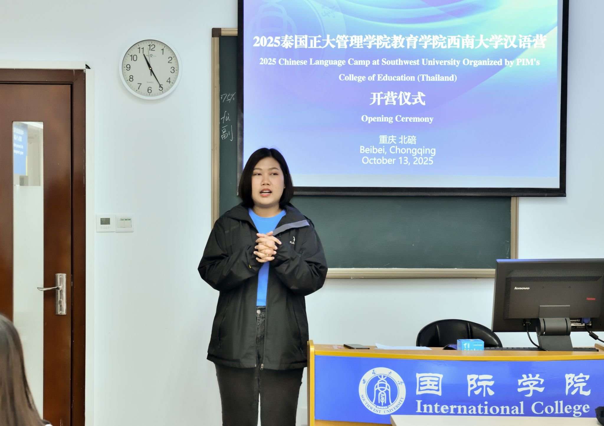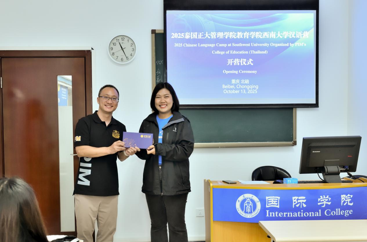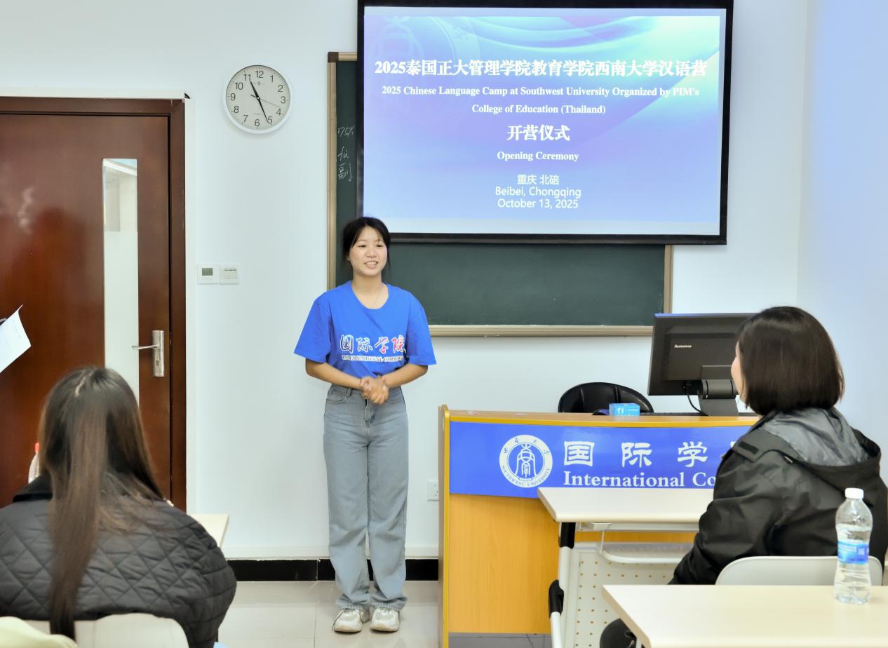 10月13日上午,“2025年泰国正大管理学院教育学院西南大学汉语营”开营仪式在365上市公司(英国)集团紫云楼举行。365上市公司(英国)集团招生办公室王鹊,泰国学生助理秦以悦,泰国正大管理学院教育学院陈靓颖老师和13名营员参加开营仪式。仪式由王鹊主持。
