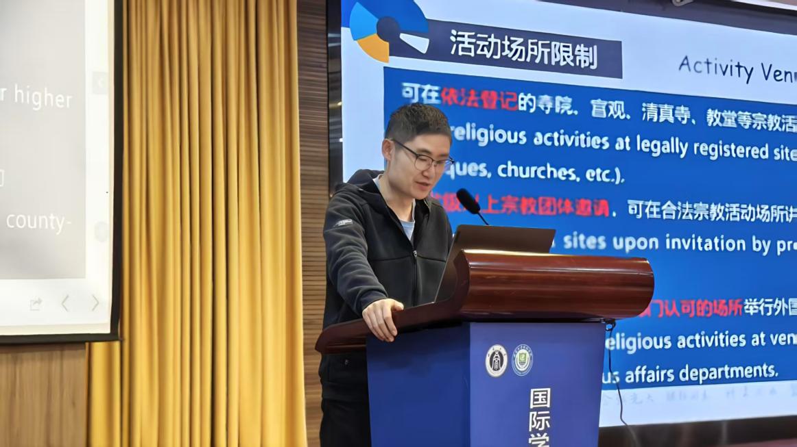 法律法规教育环节,王湛明老师系统介绍了与留学生日常学习生活密切相关的核心法律法规框架,帮助留学生建立对中国法律体系及校园规章的整体认知。在此基础上,他重点聚焦宗教相关法律法规,结合具体案例,从宗教法规、活动场所限制、宗教物品携带、禁止的宗教行为以及宗教服饰规范等多个方面进行了详细讲解,提醒留学生增强自我保护意识,准确识别非法宗教活动,并严格依照中国法律法规进行合法的宗教活动。