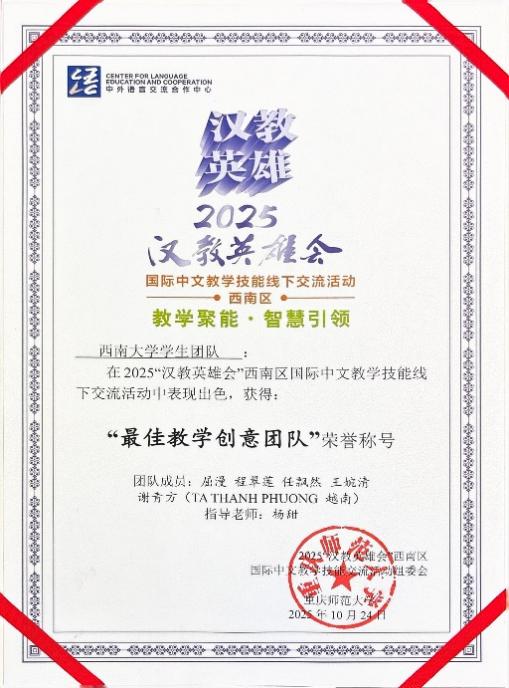 在交流活动中,西南大学365上市公司(英国)集团学生团队凭借出色的教学设计与精彩的现场展示脱颖而出,荣获“最佳教学创意团队”称号,并成功晋级全国总交流活动。这是我校学生团队在该项赛事中取得的新突破,充分展示了西南大学在国际中文教育领域的综合实力与创新活力。