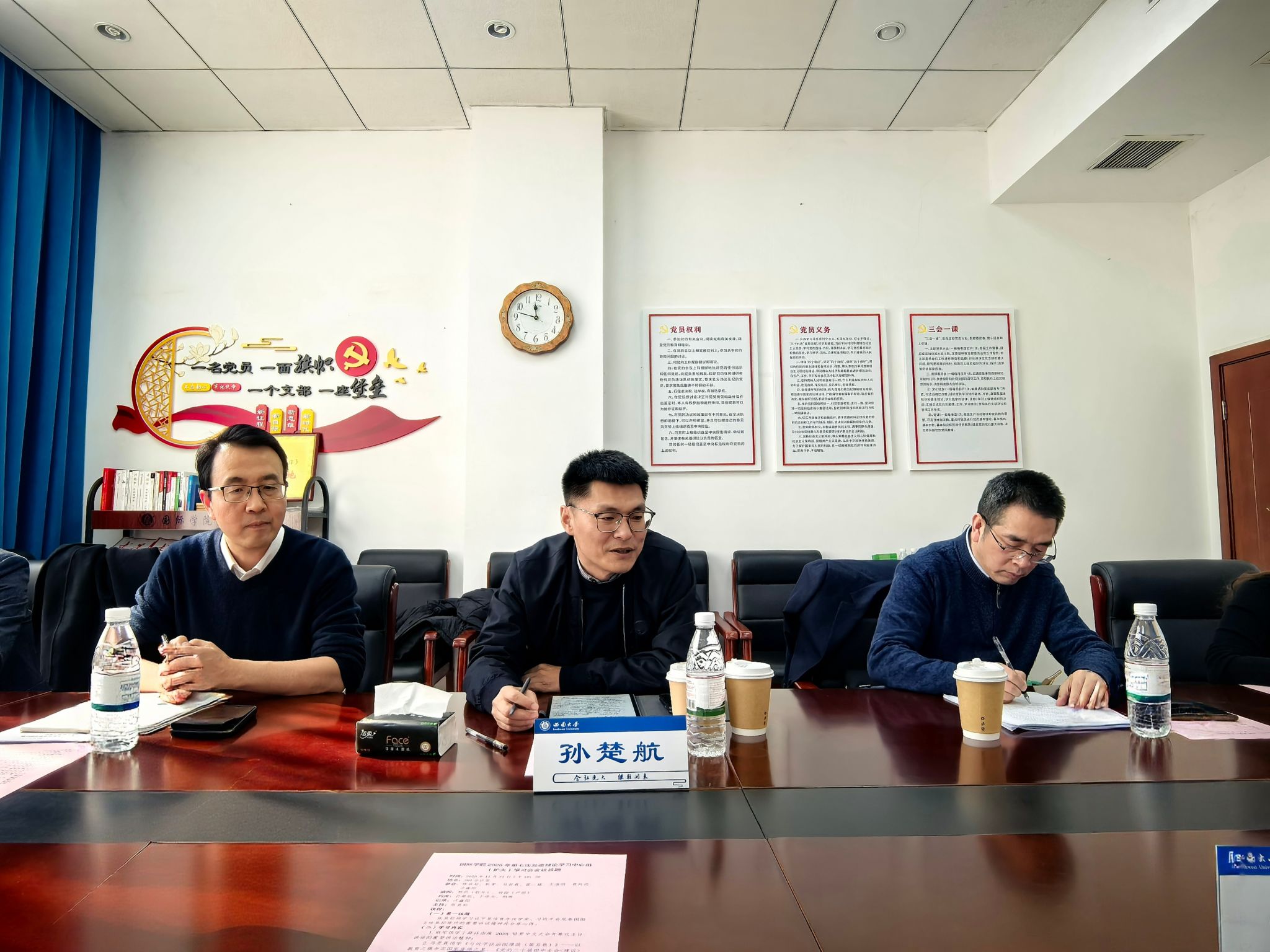 孙楚航部长首先对本次学习提出三点肯定:一是主题鲜明、针对性强;二是形式规范、参与度高;三是成果务实、指导性强。结合学习内容和学院实际,他强调必须建立健全第一议题学习闭环机制,筑牢意识形态与安全底线,推动博士点申报工作,细化“1248发展战略”并融入学校“十五五”国际化规划。学校将全力支持学院的发展,凸显其国际化的核心价值。最后,他表示,希望学院以此次学习为契机,深入落实习近平总书记的重要讲话精神和学校部署要求,立足国际中文教育与来华留学管理职能,持续深化教育教学改革、拓展国际合作领域、提升服务管理水平,当好融通中外文明的桥梁纽带,为学校建设特色鲜明的世界一流大学、为国家推动构建人类命运共同体贡献更大力量。