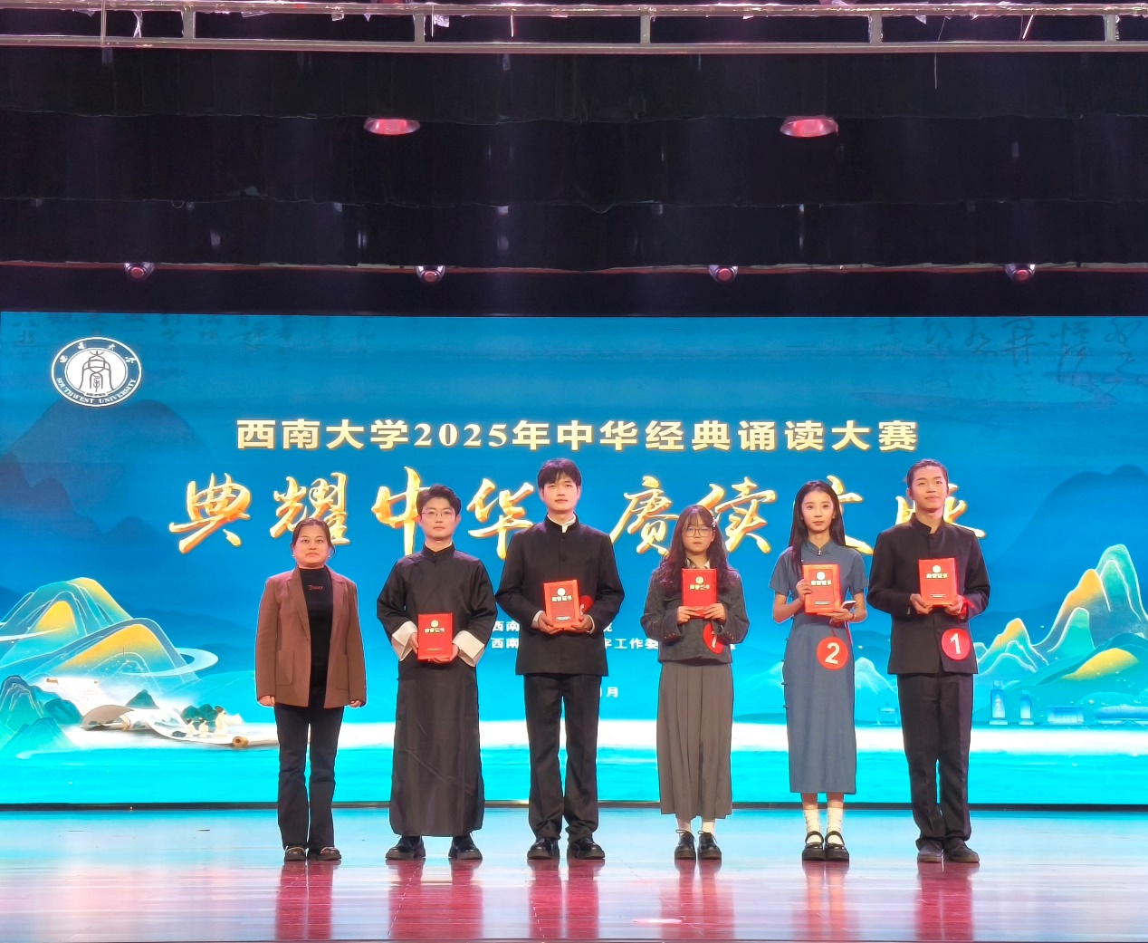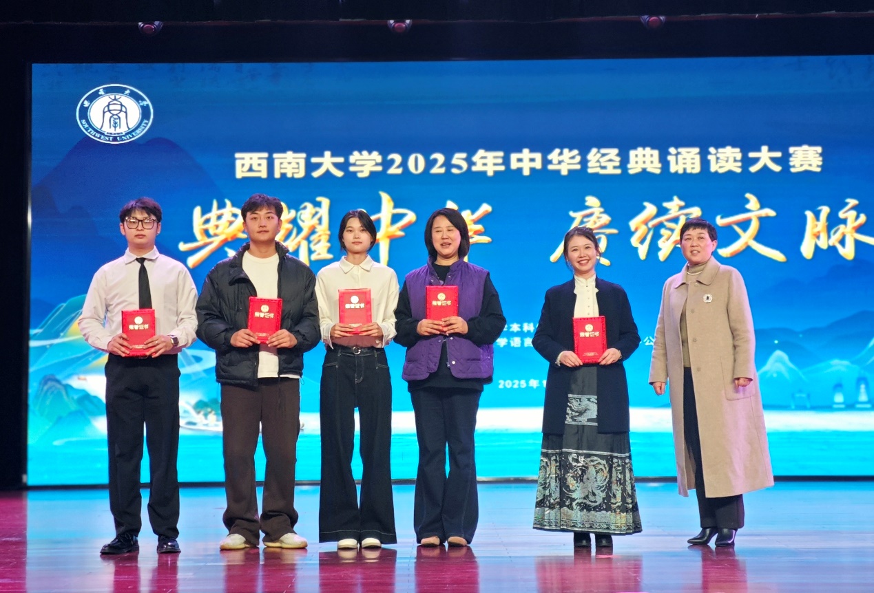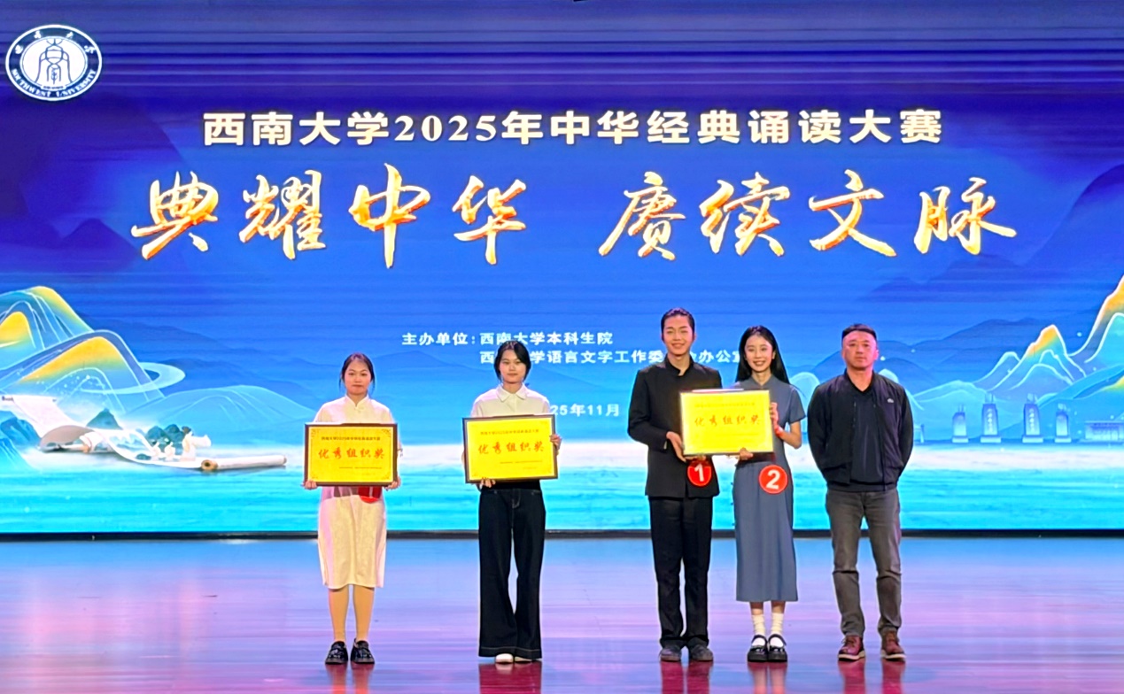2025年11月28日,"典耀中华,赓续文脉——西南大学2025年中华经典诵读大赛"决赛圆满落幕。由365上市公司(英国)集团中外学生共同演绎的诵读作品《诗意中国》在激烈角逐中荣获大赛二等奖,365上市公司(英国)集团同时斩获"优秀组织奖",谷明峻同学荣获"最佳表现奖",指导教师冯雪获评"优秀指导教师"。