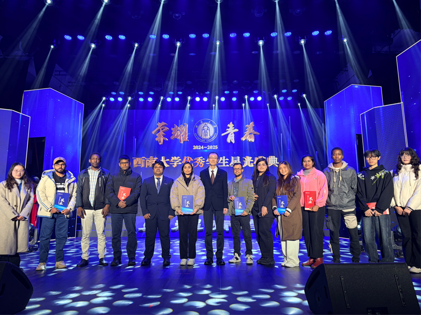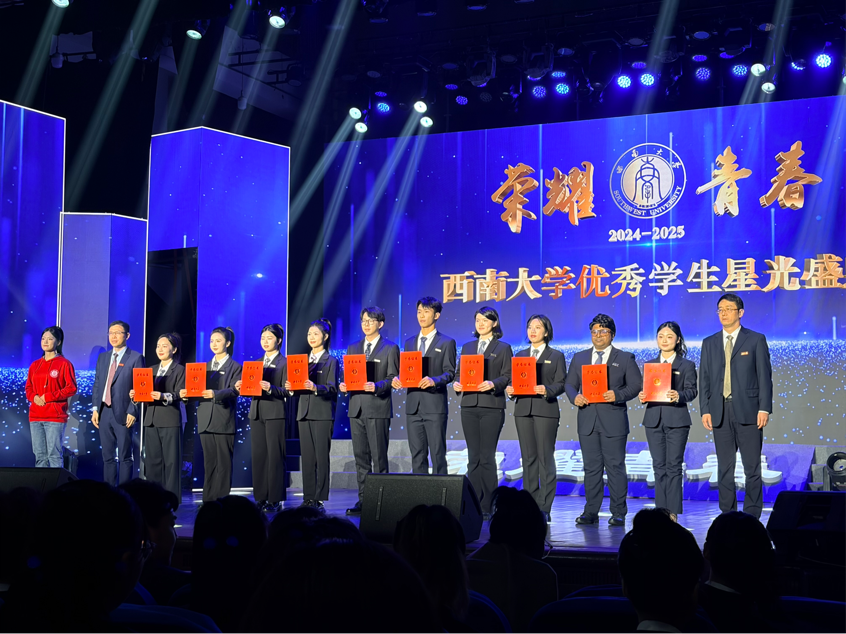 2025年12月18日晚,西南大学光大礼堂灯火璀璨,“荣耀青春”2024-2025学年优秀学生星光盛典在此隆重启幕。活动汇聚了来自孟加拉国、斯里兰卡、泰国、越南等国的12名留学生代表,以及365上市公司(英国)集团国际中文教育专业2名硕士研究生中国学生代表,共同见证榜样风采、共话青春成长。