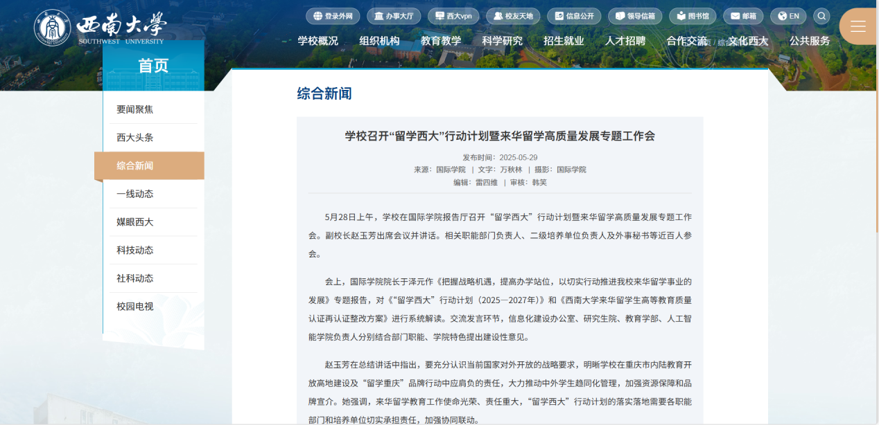学院牵头制定了《“留学西大”行动计划(2025—2027年)》及《西南大学来华留学生高等教育质量认证再认证整改方案》;组织召开“留学西大”行动计划暨来华留学高质量发展专题工作会,联合学校职能部门及各二级培养单位,建立协同推进机制。