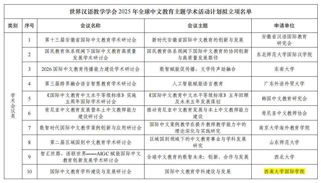 学院申报的“卓越国际中文教师培养项目”,在学校2026年度专业学位研究生项目制培养评审中获评A级,新增3个招生指标;申报设立国际中文教育博士点;推荐获批巴渝学者特聘教授1人。积极推进2025年全英文专业申报工作,“人工智能”(本科)、“基础心理学”(硕士)、“药学”(硕士)3个专业获批建设。《生药学》获批重庆市2025年度一流本科(来华留学英语授课)课程。“国际中文教育学科建设与发展研讨会”申报获批世界汉语教学学会全球中文教育主题学术活动计划。