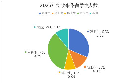 2025年共招收来自90个国家的长短期国际学生2132人,招生规模创近三年新高。长期生人数达1459人,其中学历生1228人,规模位居全市高校首位。新生报到率达76.9%,自费生占比约50%,生源结构显著优化。