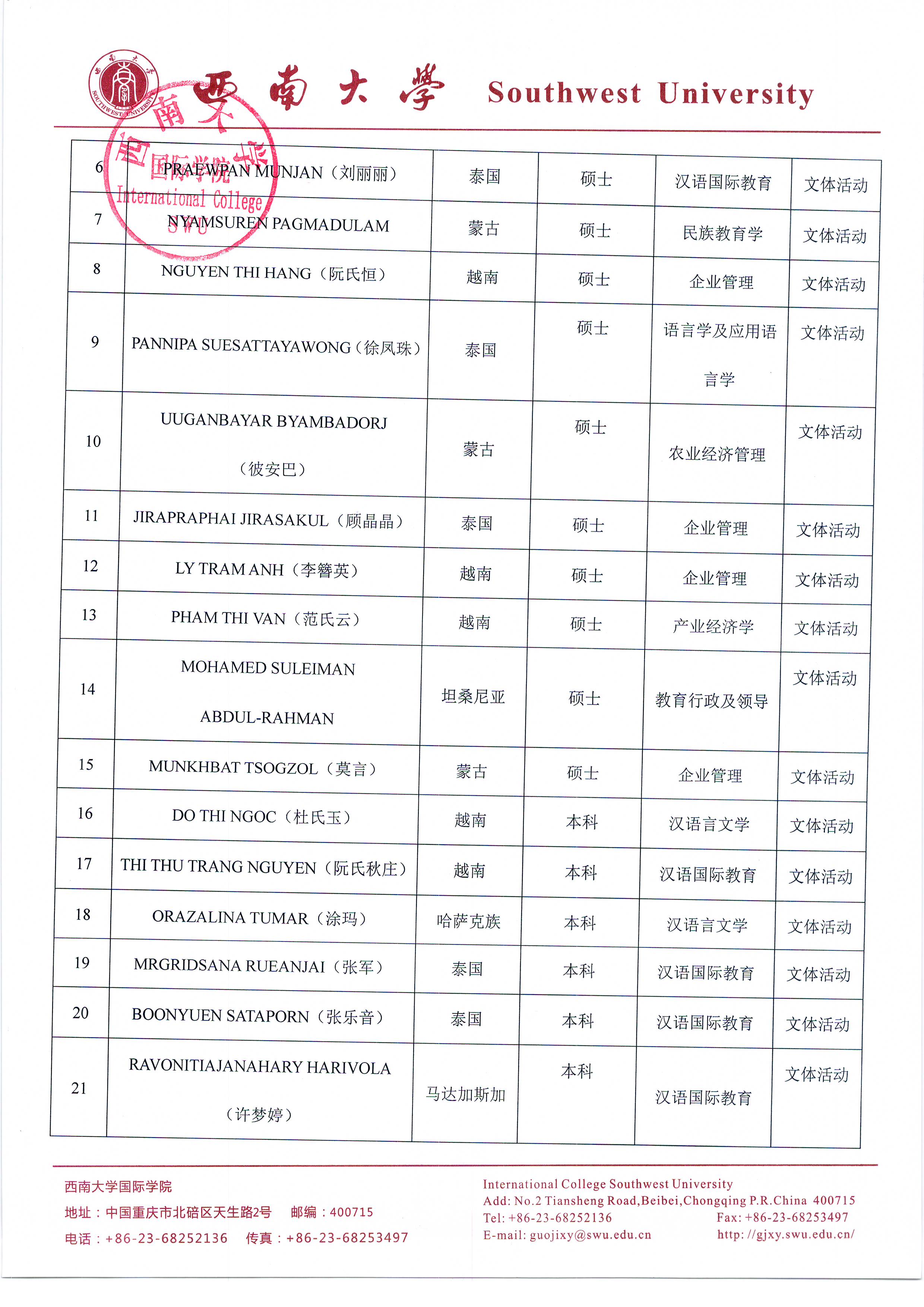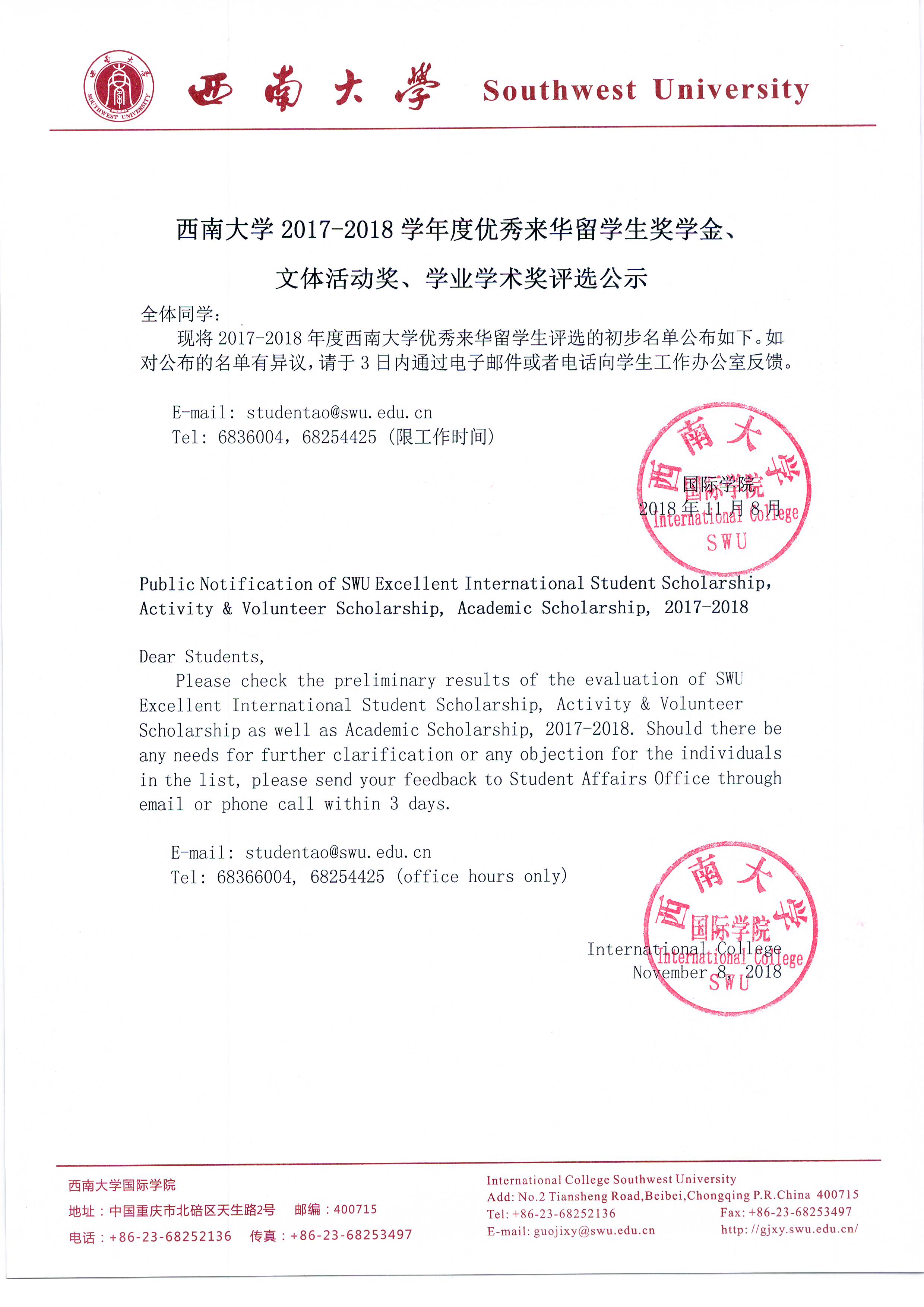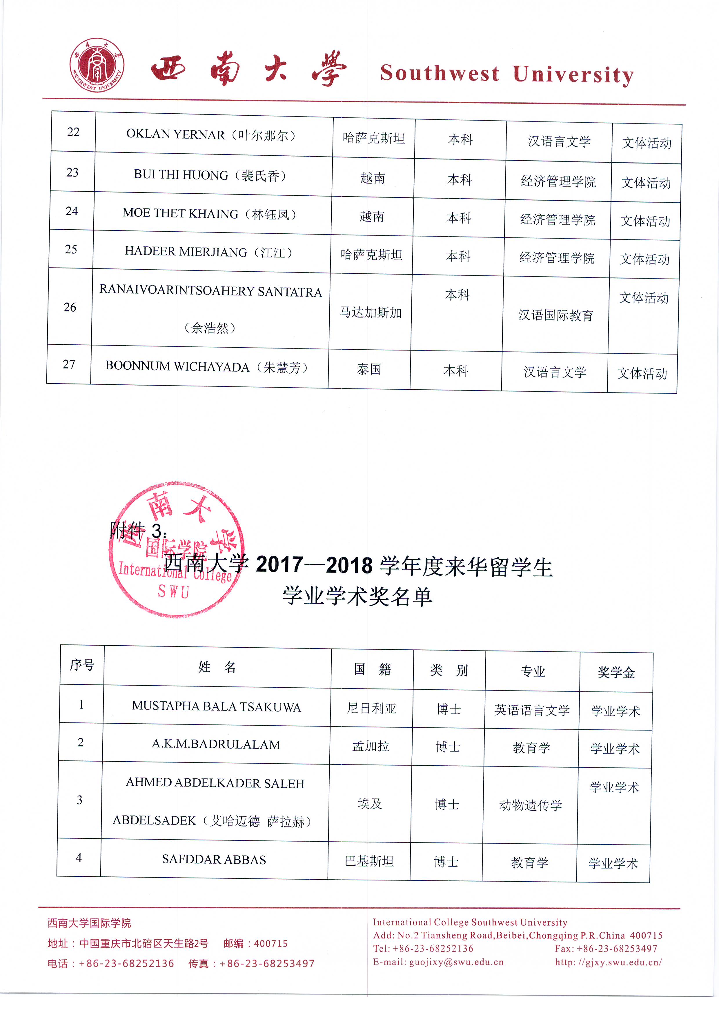 西南大学2017-2018学年度优秀来华留学生奖学金、文体活动奖、学业学术奖评选公示
