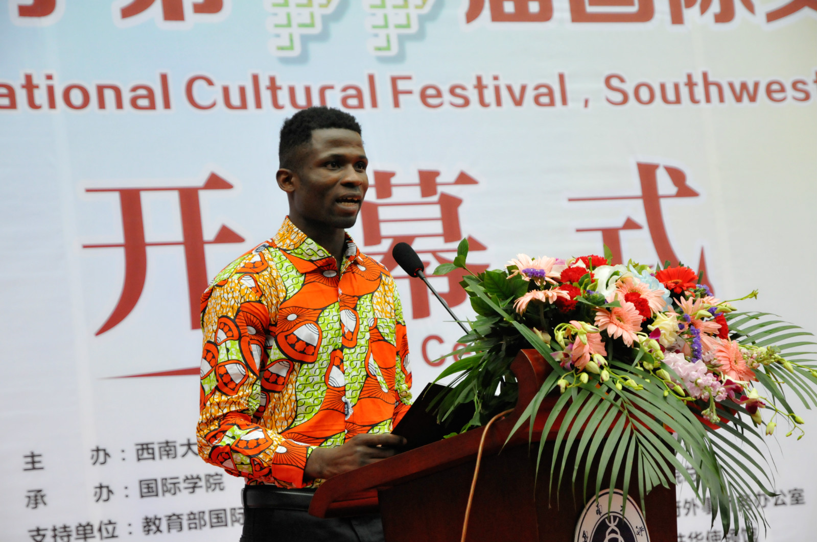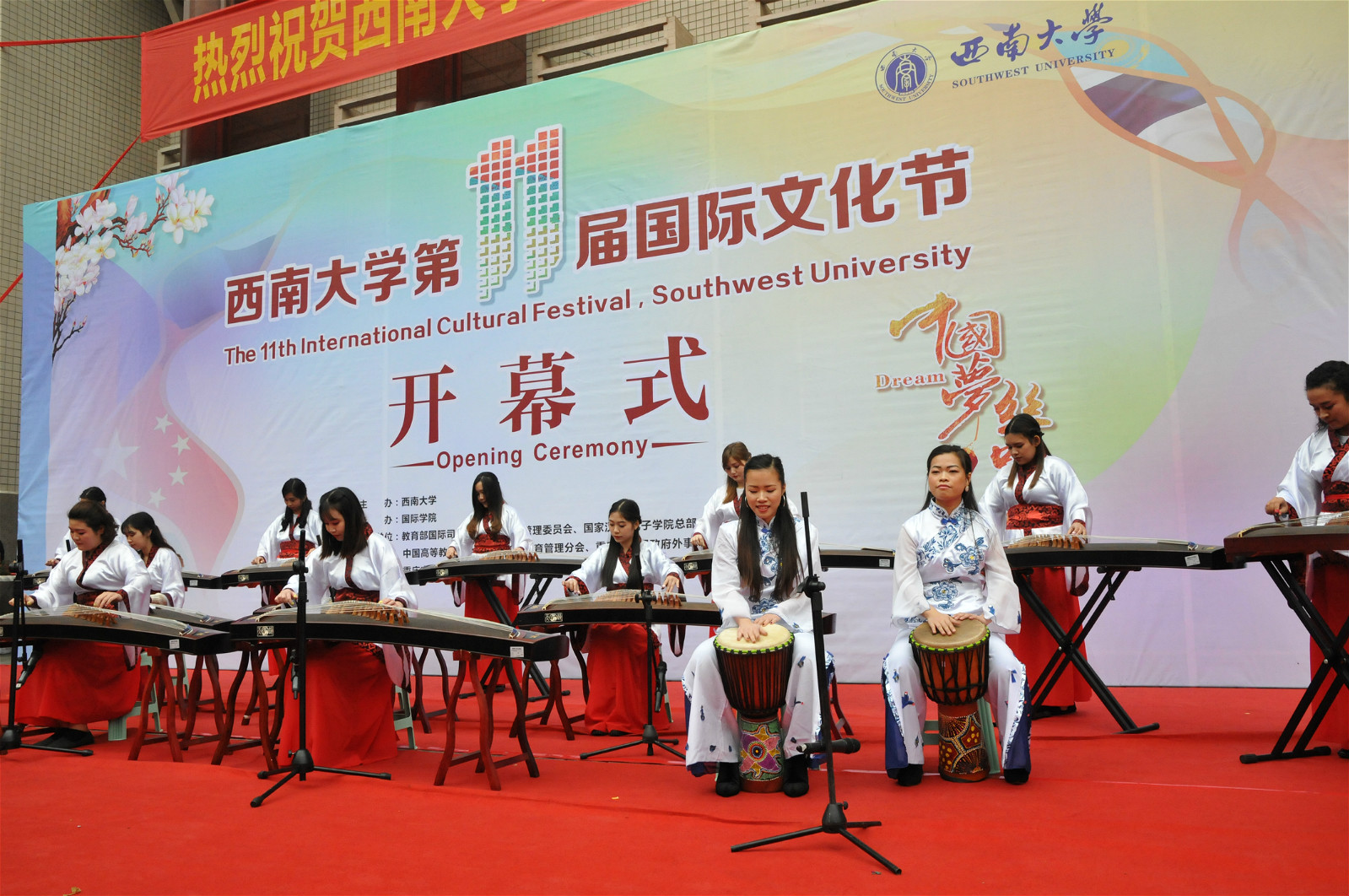 开幕式上,20余个国家的国际学生联袂献上了精彩的歌舞表演、古筝弹奏及华丽的民族服装秀。副校长靳玉乐教授为文化节致辞,祝福文化节顺利举办。教师代表杨甜及来自刚果(布)的国际学生代表思拉河分别发言,对文化节的开幕表示祝贺。