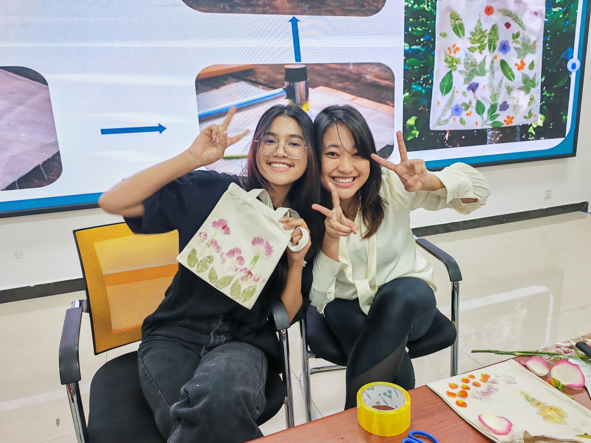 让我们把春天“敲”进口袋里。“植物拓染”是中国传统文化之一,是自然之美的见证。“拓染”活动开始,三个小组的成员挑选自己喜欢的鲜花,大家纷纷开启一场“力气活儿”,锤声、欢笑声瞬间充满整间教室。
