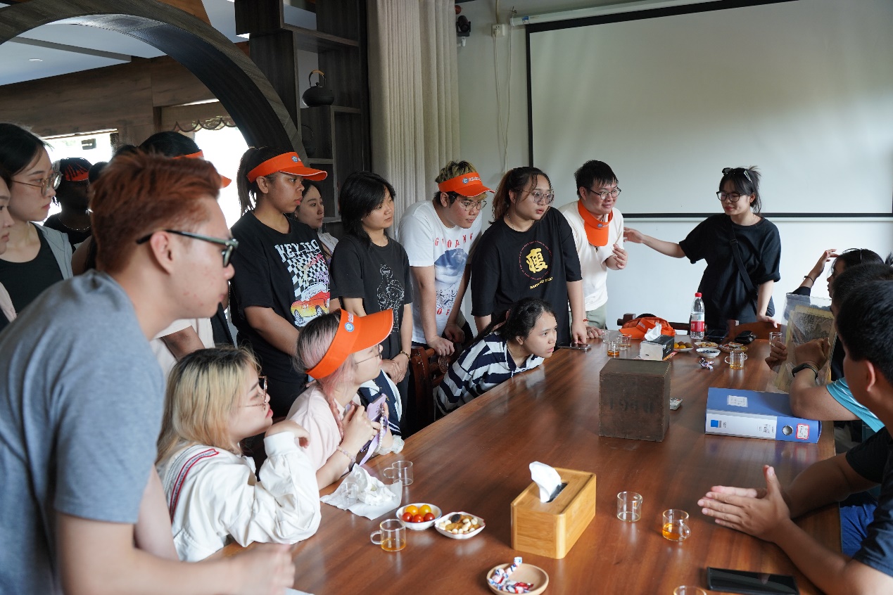 缙云甜茶分布在缙云山山脊一带,每年可采摘三次,产量极少,由于常年受缙云山良好的自然环境滋养,其微量元素种类与含量远超其他茶钟。同时,经过炒制后冲泡出的茶汤金黄透亮,口感回甘不腻,具有一定的养生健体之效,是集“药、茶、糖”于一体的茶中佳品。来自西大茶厂的刘波老师不仅在登山沿途结合随处可见的茶树给同学们详细介绍甜茶的采摘、加工与功用,也与大家分享了茶箱、茶画等个人藏品并通过108张茶文化明信片向同学们展现了百年间茶叶的流传与发展。