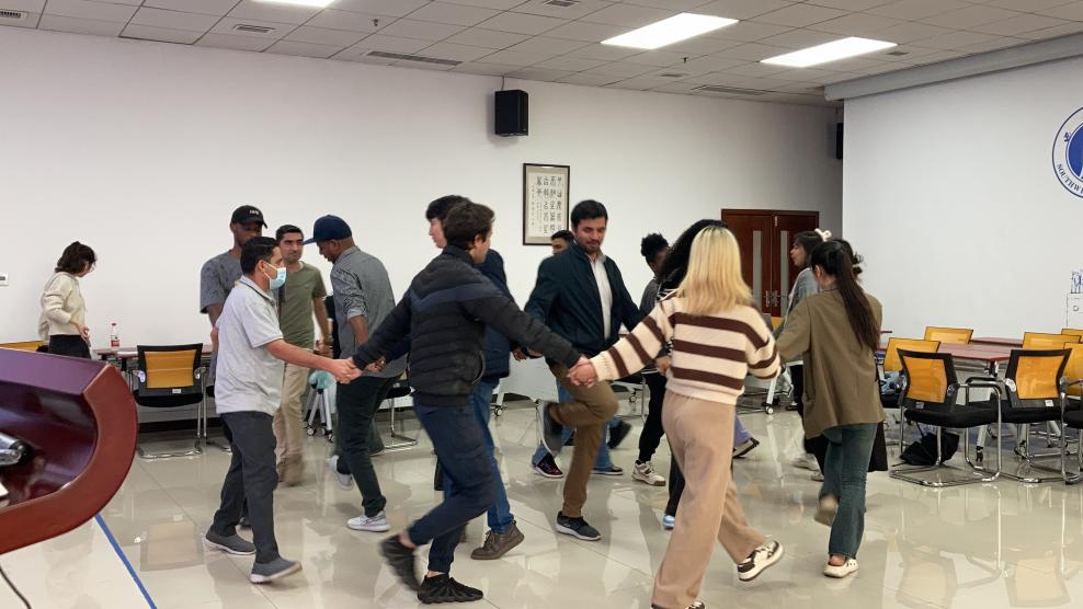 同心同向聚共识、合力合拍促学进。全场同学分为内、外两圈,呈同心圆状随着音乐转圈跳舞。背景音乐暂停后,面对面的两位同学便可互相自我介绍,开启友谊之旅。“同心圆”寓意为团结、包容、融合、共识,象征为圆满、美好、共享,在今天也代表着世界各地的留学生对“留学西大”品牌的深度信赖。