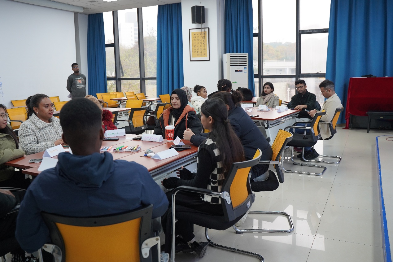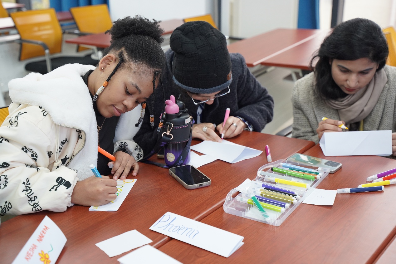 手挽手,心贴心,国际学生在此刻紧密相连。随着主持人张晓彤引领全体国际学生共同宣读团体活动准则,本次团体辅导活动的首个环节——“粘粘乐游戏”拉开了序幕。在柔和而悠扬的背景音乐烘托下,所有参与者首尾相接,形成一个温馨的圆圈。随着主持人的一声令下,成员们迅速行动起来,组成一个个临时小队。尽管队伍中的成员们初次相识,但游戏成为了他们相互了解、彼此靠近的桥梁。那份初见的陌生与拘谨,在一次次的亲密接触与欢笑中逐渐消散;取而代之的是日益增长的熟悉感与欢乐,它们伴随着阵阵笑声与嬉戏声,在每个人心中生根发芽。完成这一场充满欢声笑语的破冰游戏后,国际学生们卸下了羞涩的面纱,自发组成小组,以“姓名牌”为媒介,用彩笔挥洒自如地写下自己的名字,并向组内的新朋友们热情洋溢地介绍自己。